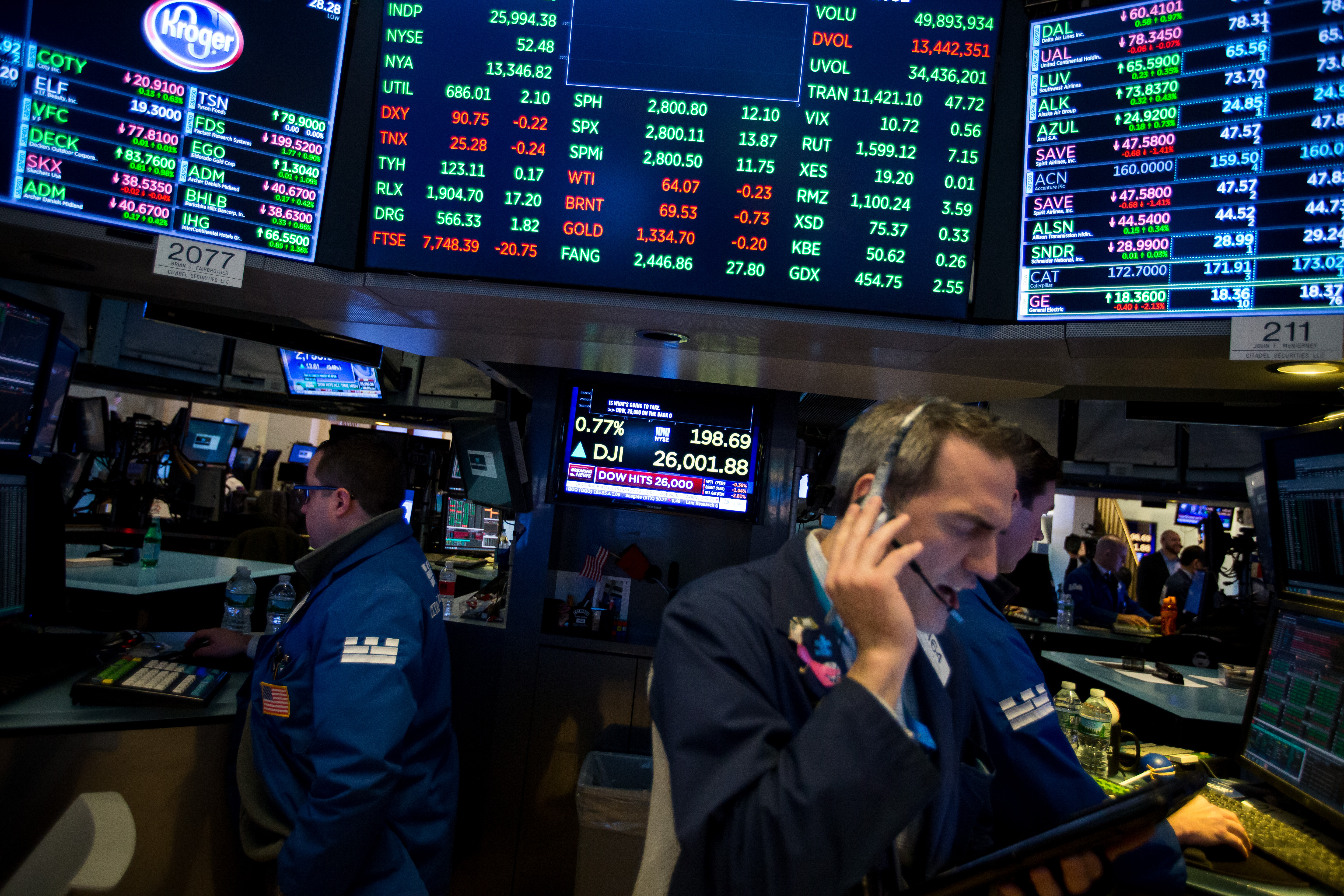 A television screen displays news about the Dow Jones Industrial Average reaching 26,000 while traders work on the floor of the New York Stock Exchange (NYSE) in New York, U.S. (Photographer: Michael Nagle/Bloomberg)