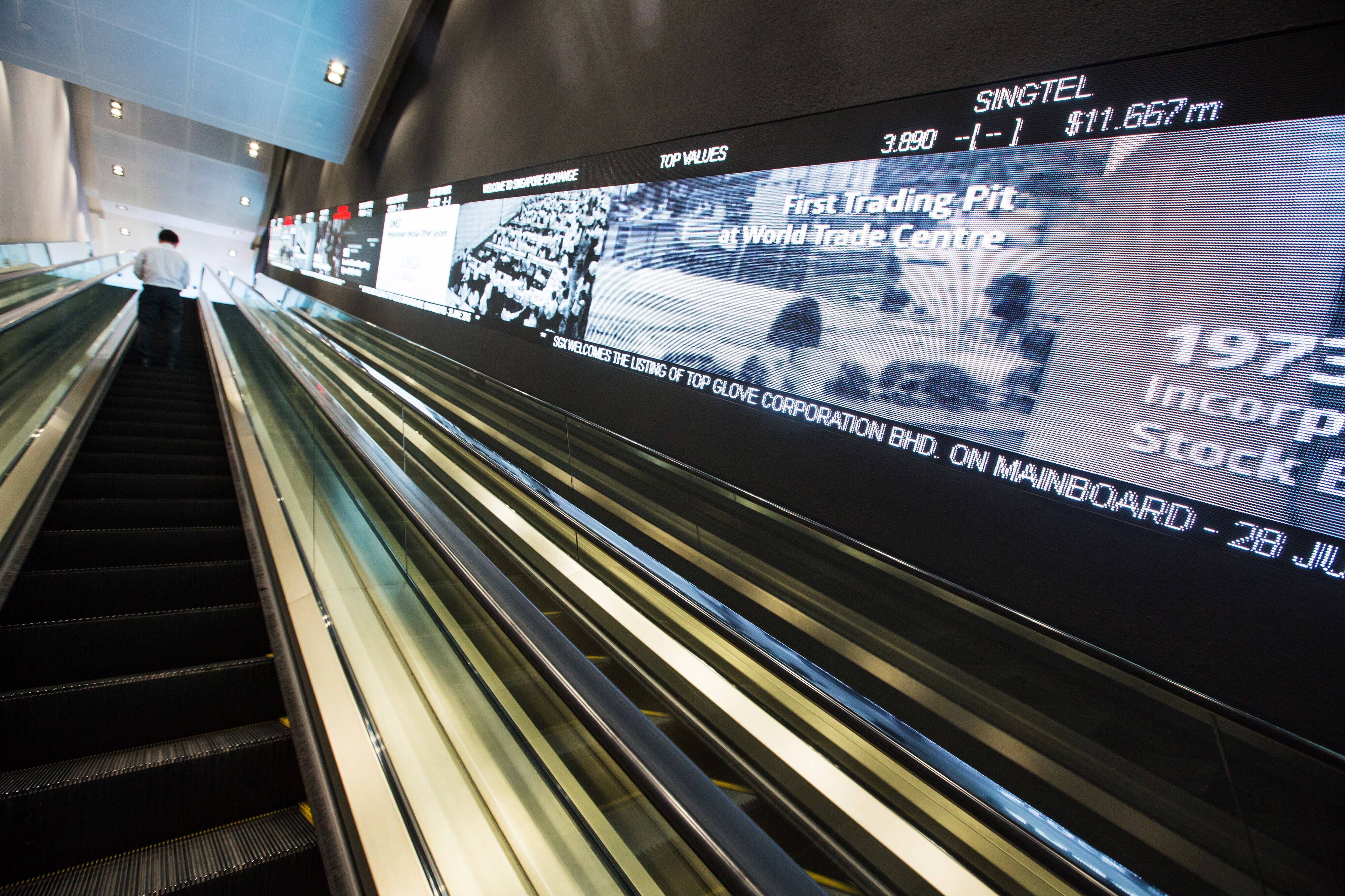 A man rides an escalator past an electronic screen at the Singapore Exchange Ltd. (SGX) headquarters in Singapore. (Photographer: Nicky Loh/Bloomberg)