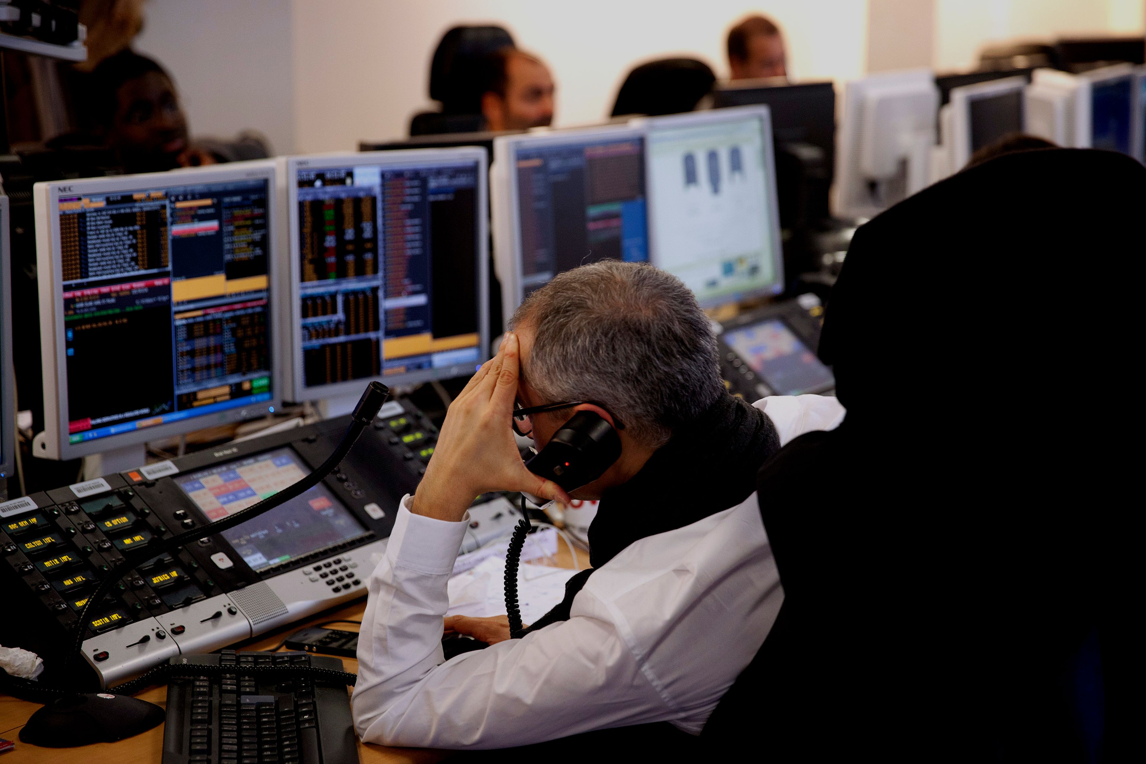 A trader reacts as he monitors financial data displayed on his computer screens at brokerage firm. (Photographer: Balint Porneczi/Bloomberg)