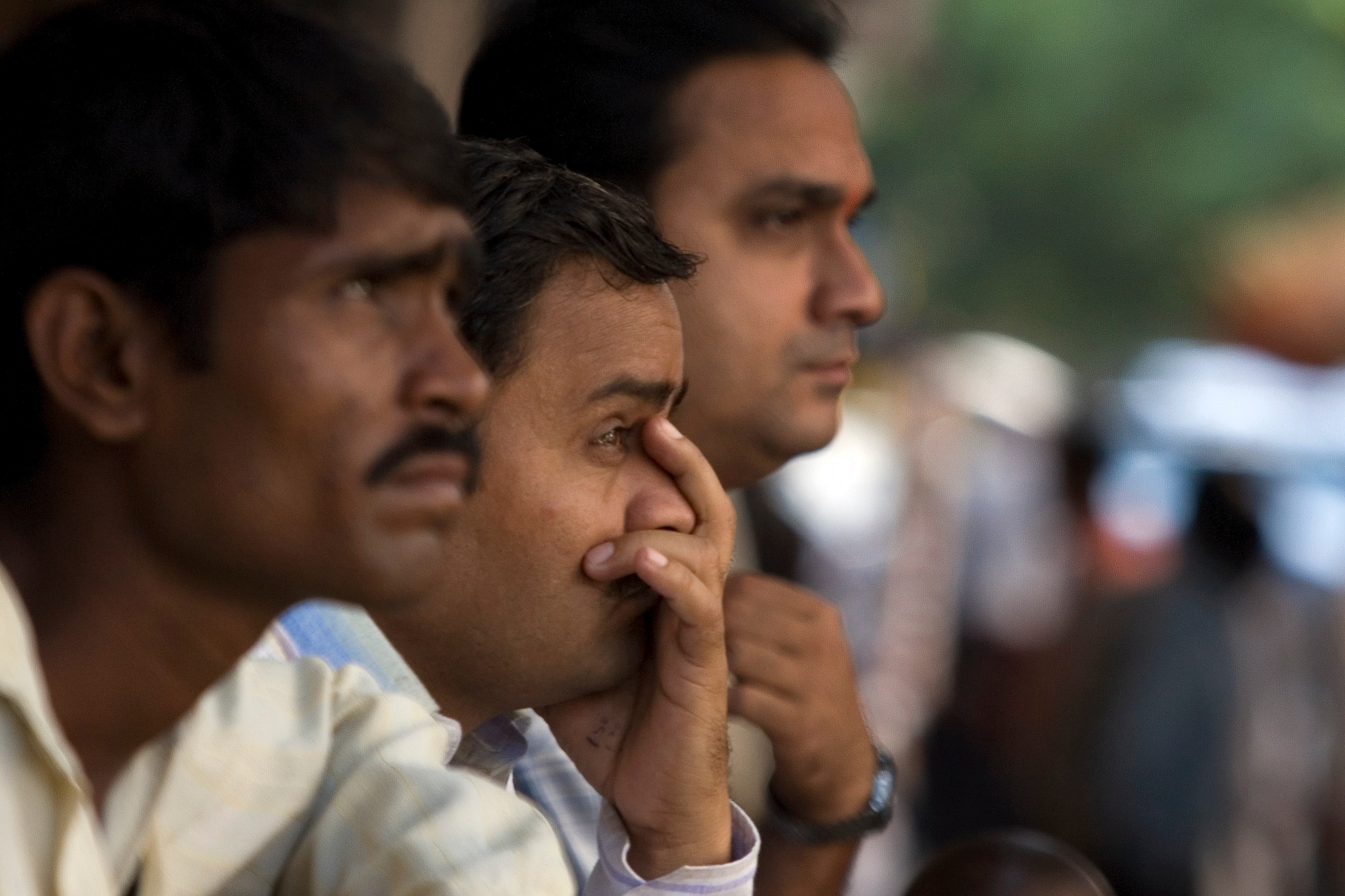Bystanders react to an electronic screen displaying stock quotes outside of the Bombay Stock Exchange in Mumbai, India (Photographer: Prashanth Vishwanathan/Bloomberg News)