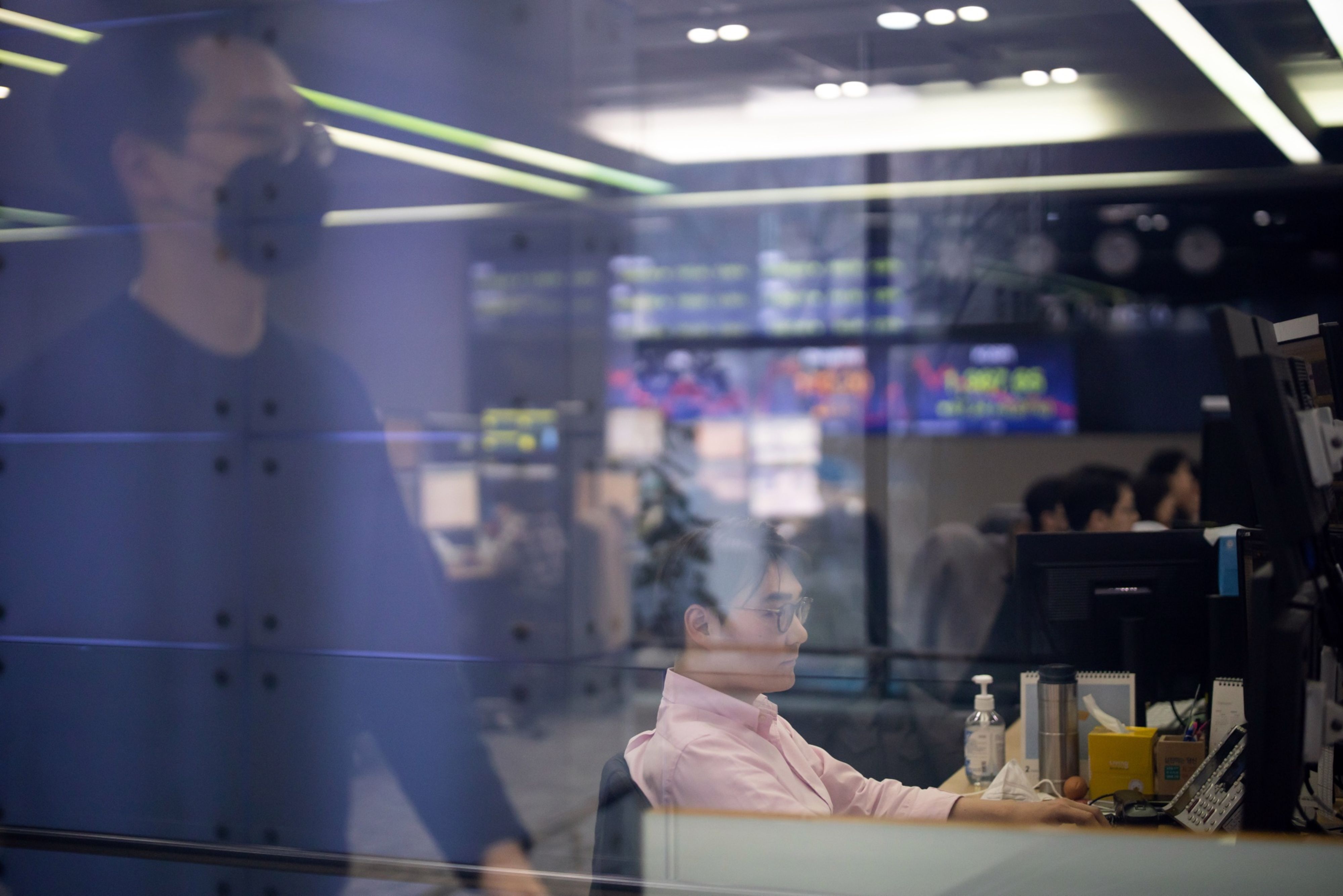 A foreign currency dealer speaks on a phone as other dealer wearing a protective mask walks inside a dealing room, in Seoul, South Korea. (Photographer: SeongJoon Cho/Bloomberg)