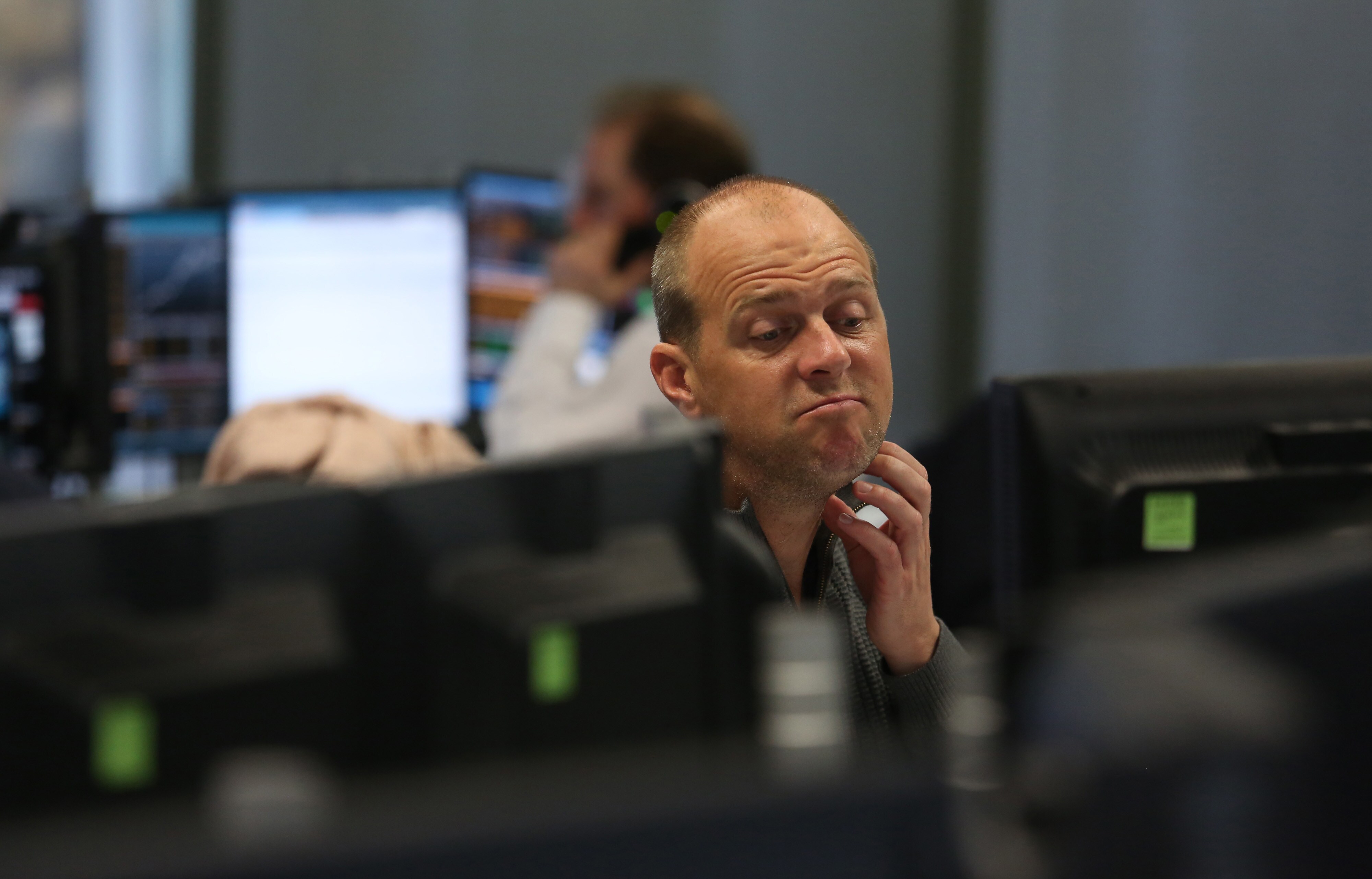 A trader reacts as he monitors financial information on computer screens on the trading floor at Panmure Gordon & Co., while results continue to be announced in the 2015 general election in London, U.K. (Photographer: Chris Ratcliffe/Bloomberg)