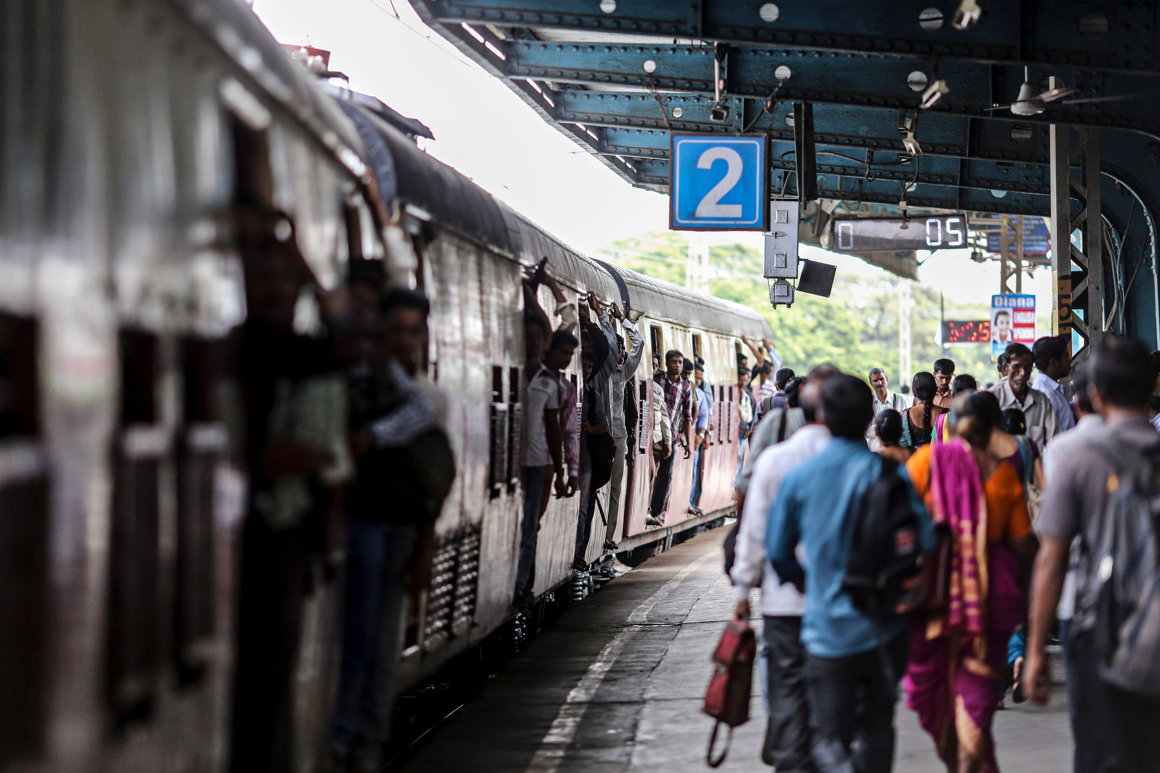 Passengers walk along a platform as a train approaches during the morning rush hour in Mumbai. (Photographer: Dhiraj Singh/Bloomberg)