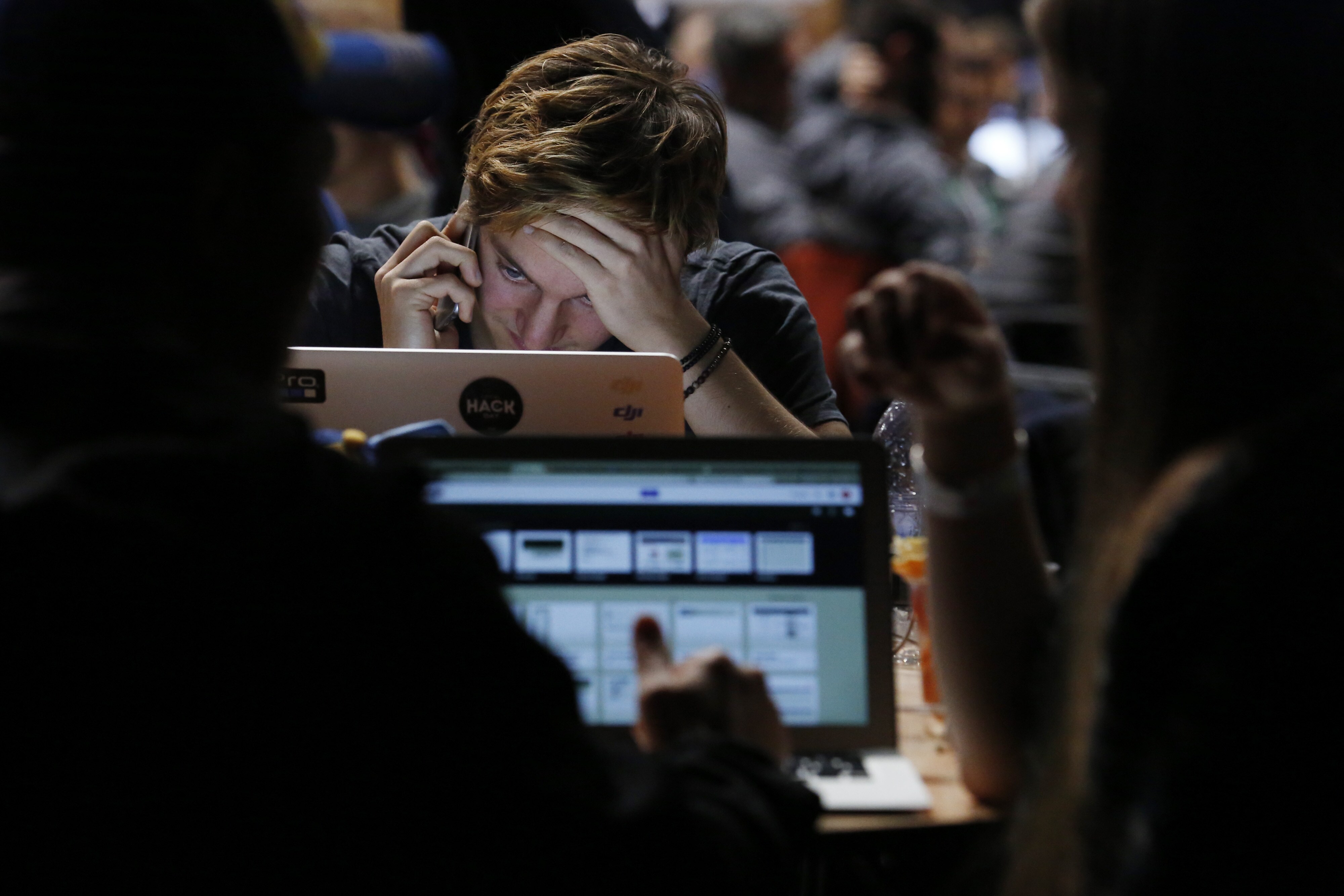 An attendee uses a mobile phone whilst looking at his laptop computer screen. (Photographer: Luke MacGregor/Bloomberg)
