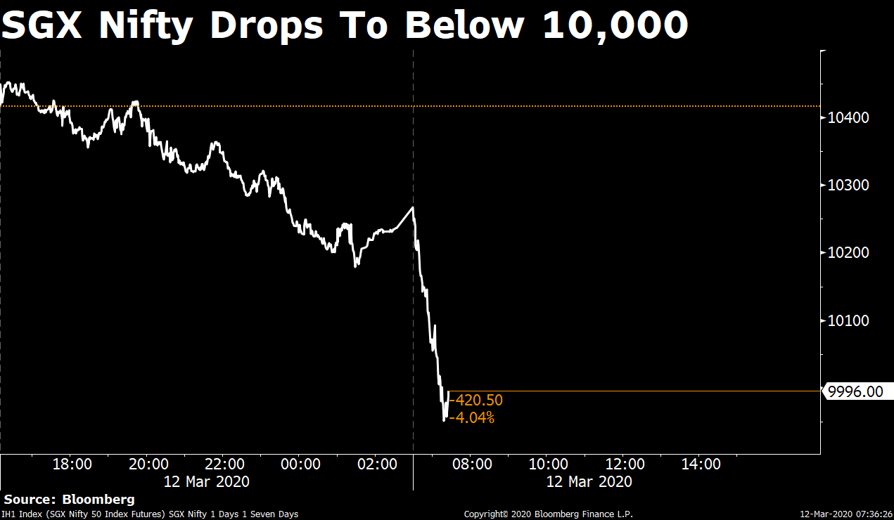 Shares in Japan sank and Australian equities extended recent losses, getting little respite from that nation's stimulus package. Early gains for American equity futures fizzled as investors awaited a press conference from President Donald Trump. Oil edged up after another slide. The Singapore-traded SGX Nifty, an early indicator of NSE Nifty 50 Index's performance in India, fell over 4 percent to 9,995.50 as of 7:38 a.m.
