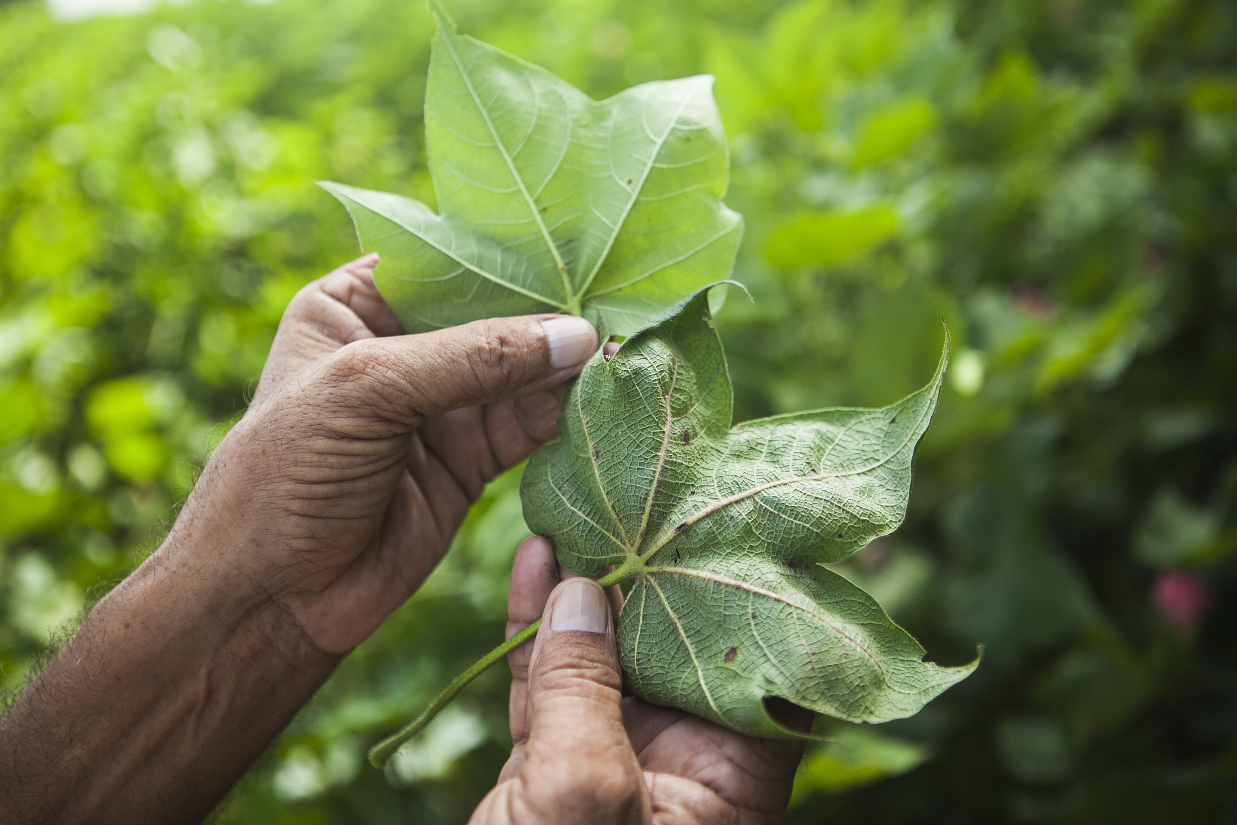 A farmer displays for comparison the leaf from a healthy cotton plant (left) and a leaf from a pest-ridden plant on his farm in India. (Photographer: Prashanth Vishwanathan/Bloomberg).