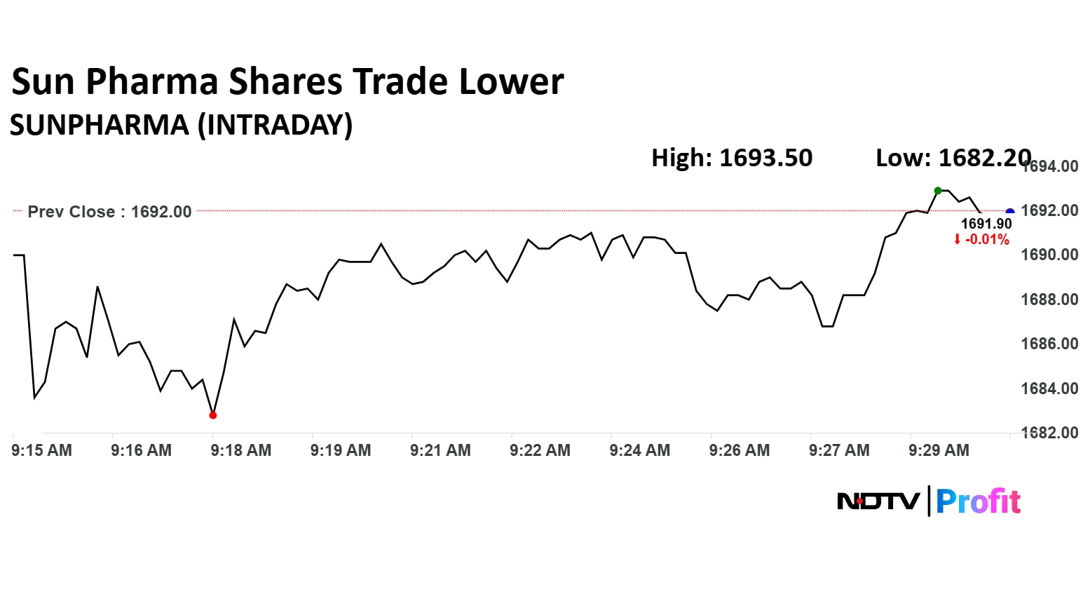 Shares of Sun Pharma fell as much as 0.12% to Rs 1,690 apiece. They pared losses to trade 0.01% lower at Rs 1,691.90 apiece, as of 9:31 a.m. This compares to a 0.32% decline in the NSE Nifty 50.