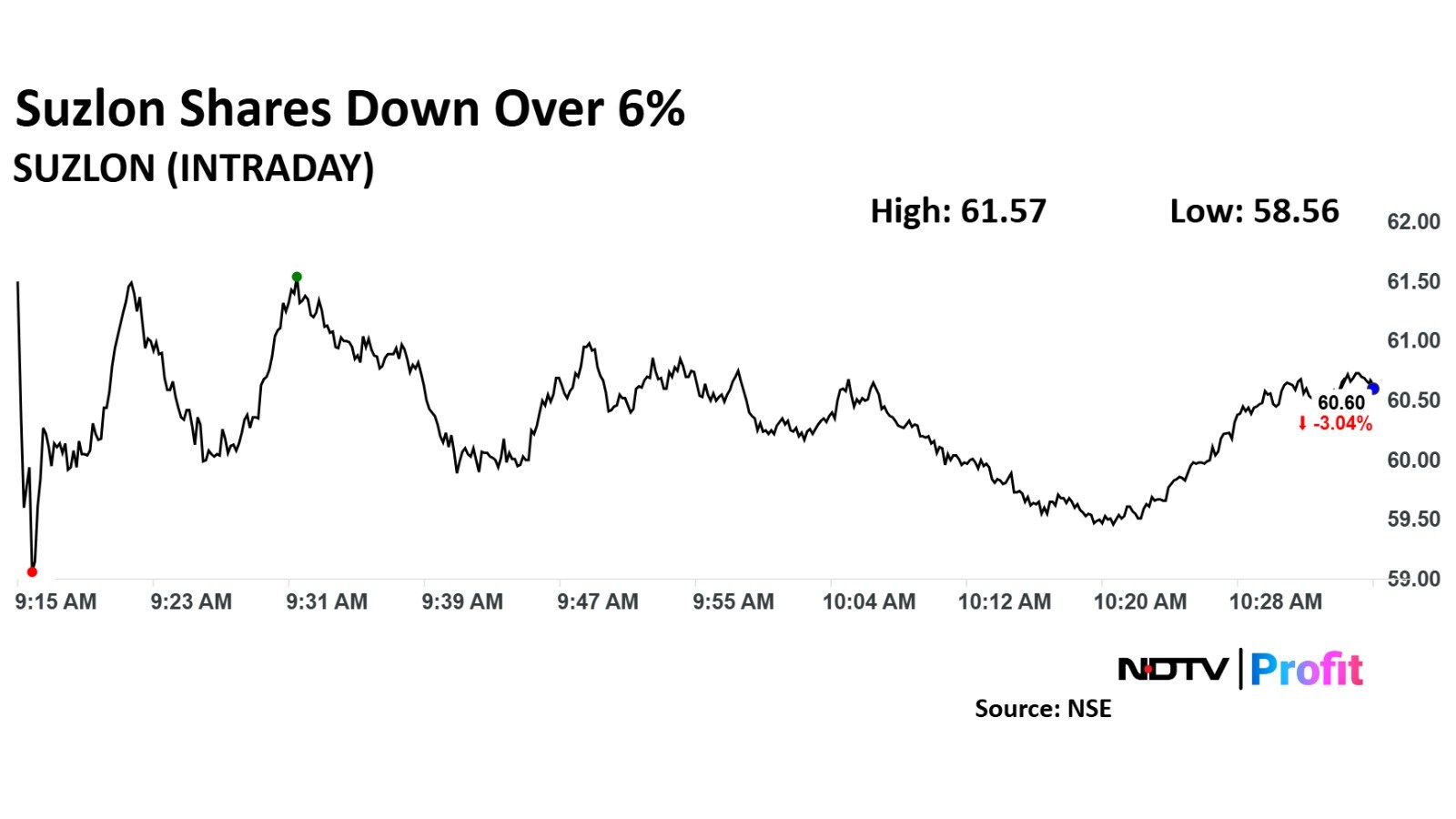 Suzlon Energy stock fell as much as 6.30% during the day before paring loss to trade 3.20% lower at Rs 60.50 apiece as of 10:38 a.m., compared to a 0.36% advance in the benchmark Nifty 50.