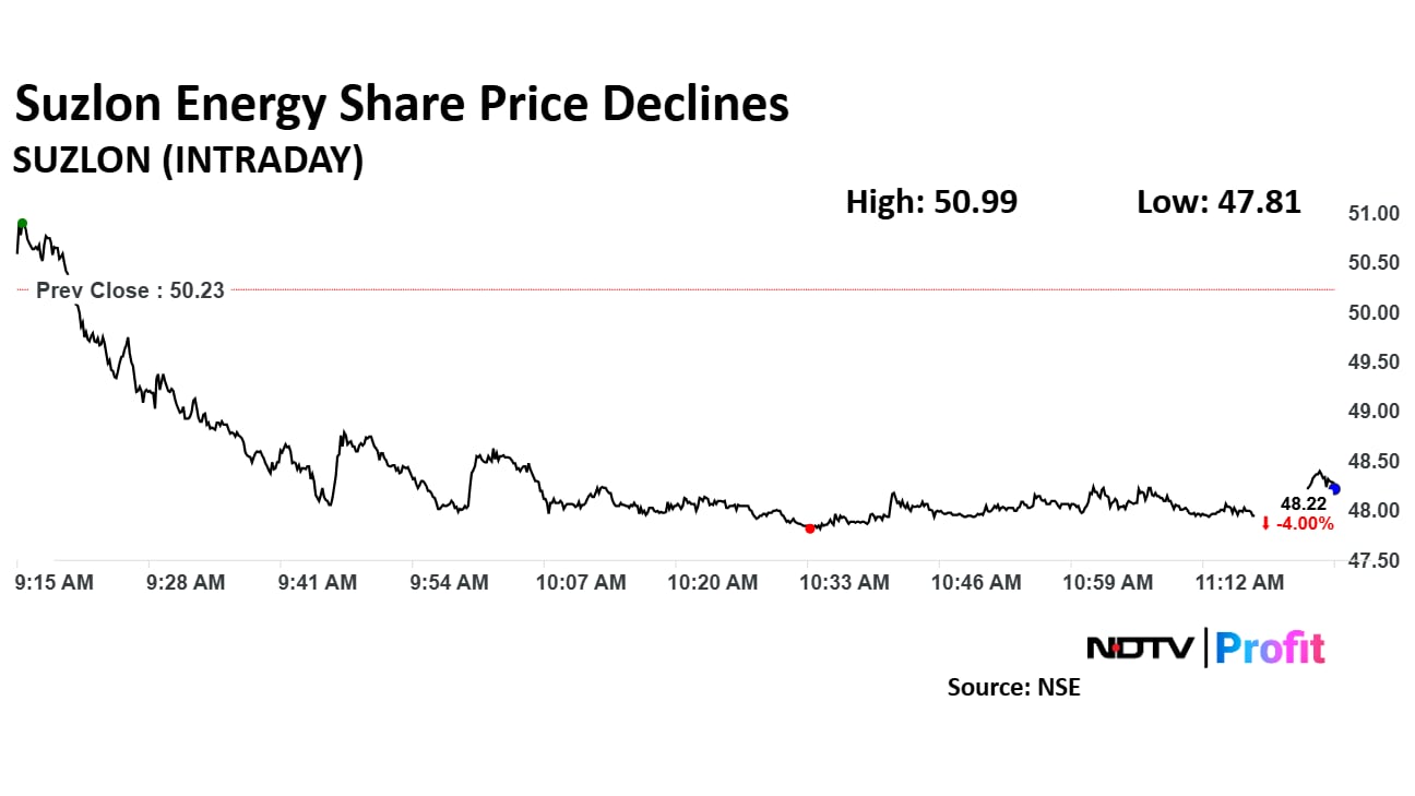Suzlon Energy share price declined 4.82% to Rs 47.81 apiece, the lowest level since June 11, 2024. However, it recovered slightly later to trade 2.89% lower at Rs 48.78 apiece as of 11:49 a.m. as compared to 0.80% advance in the NSE Nifty 50 index.