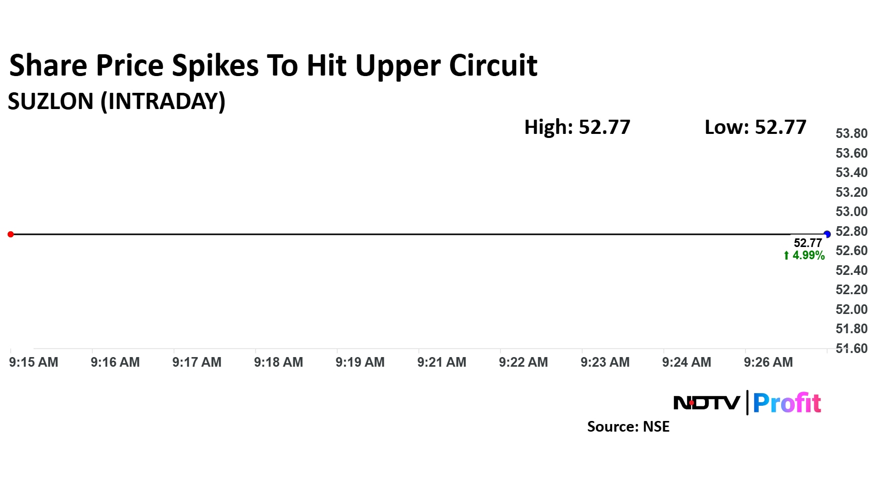 Suzlon Energy Ltd.'s shares rose nearly 5% after reporting a surge in its third quarter net profit and getting a ratings upgrade from Nuvama. The brokerage firm upgraded Suzlon's stock from 'hold' to 'buy', citing robust earnings and order book, and valuation comfort following recent price corrections.