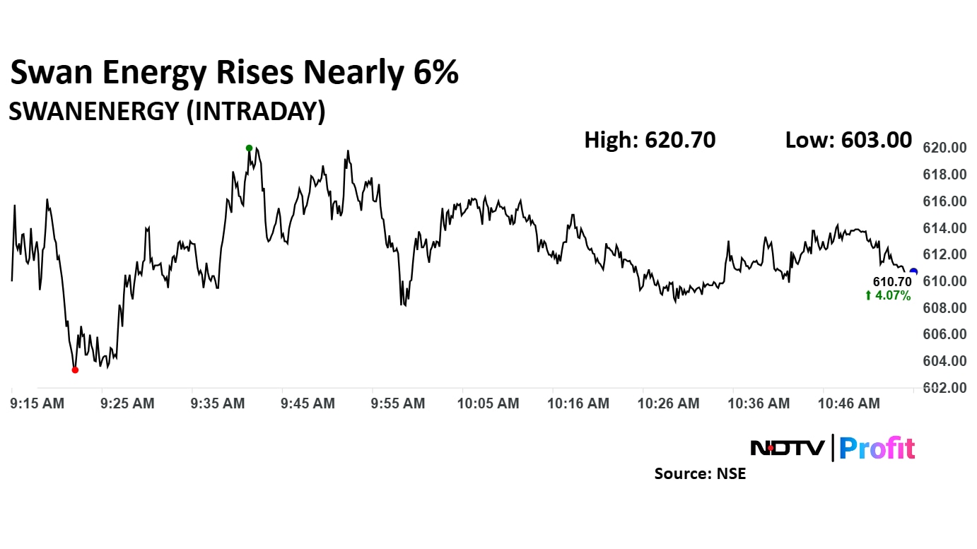Swan Energy share price rose 5.78% to Rs 620.70 apiece, the highest level since Sept 26. It pared gains to trade 3.87% higher at Rs 609.65 apiece as of 10:35 a.m., as compared to 1.75% advance in the NSE Nifty 50 index.
