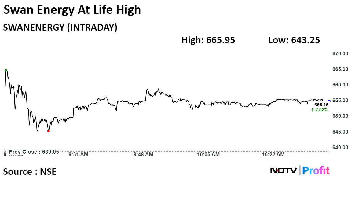 Swan Energy's stock rose as much as 4.21% during the day to Rs 665.95 apiece on the NSE. It was trading 2.43% higher at Rs 654.60 per share compared to a 0.27% advance in the benchmark Nifty 50 at 10:34 a.m.