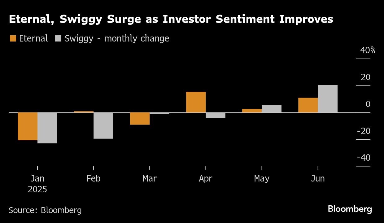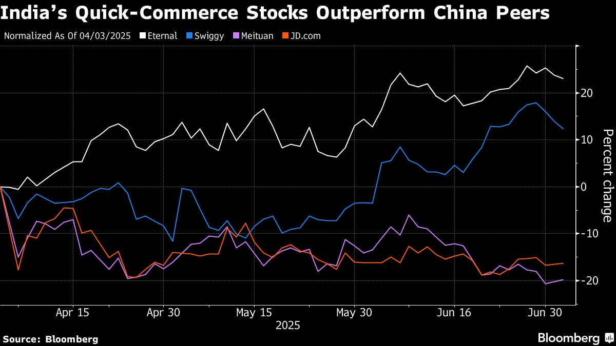 Shares of Swiggy Ltd. climbed 20% last month, topping the NSE Nifty 100 Index, while Eternal Ltd. advanced 11%. The rally in India's fast-growing quick-commerce sector — which delivers daily essentials in just minutes — contrasts sharply with losses for counterparts in China, where a fierce price war has battered food-delivery firms.