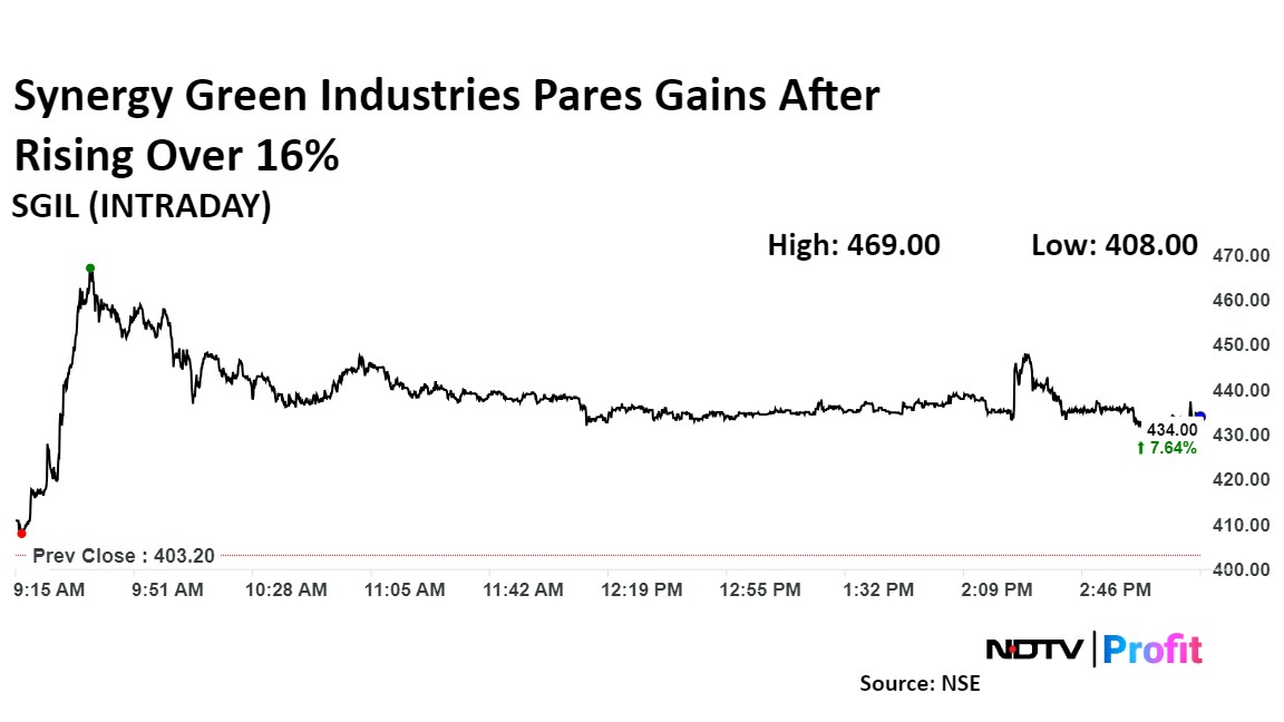 Synergy Green Industries stock rose as much as 16.32% during the day before paring gains to trade 7.43% higher at Rs 433.15 per share as of 3:20 p.m. This compares with a 1.23% decline in the benchmark Nifty 50.