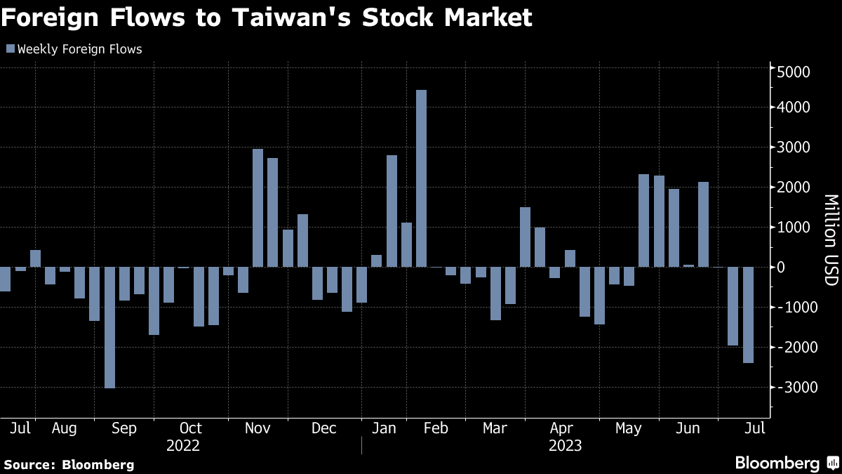 With exports falling for 10 consecutive months due to weak global demand for its technology products, investors are reassessing their portfolios. A recent sell-down in tech companies has driven net selling of Taiwan stocks to its highest in a year. Global funds withdrew $4.4 billion from Taiwanese equities in the two weeks through July 8.