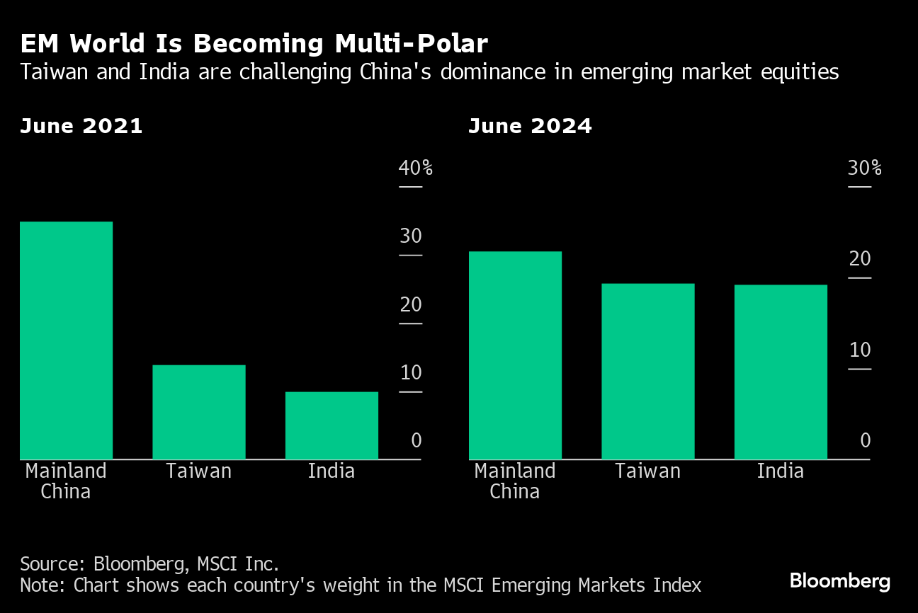 Thanks to record stock rallies, Taiwan and India now command more than 19% weightings each in the MSCI EM Index. That compares to China's 22.8%, whose standing has steadily shrunk over the past few years, Bloomberg-compiled data show.