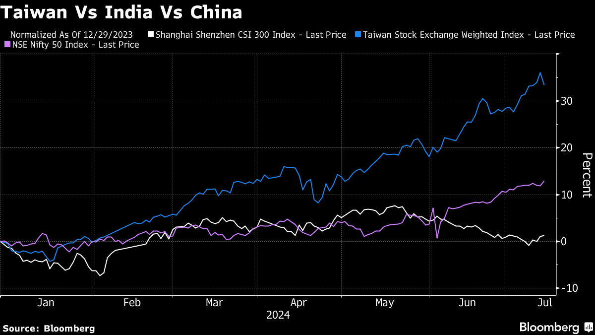 “Investors are seeking ways to manage the risk associated with China's outsized weight in emerging markets by diversifying into other markets,” said Manish Bhargava, a fund manager at Straits Investment Holdings in Singapore. “Taiwan's technological prowess, particularly in the semiconductor industry, and India's growing tech sector and digital economy make them attractive alternatives.”