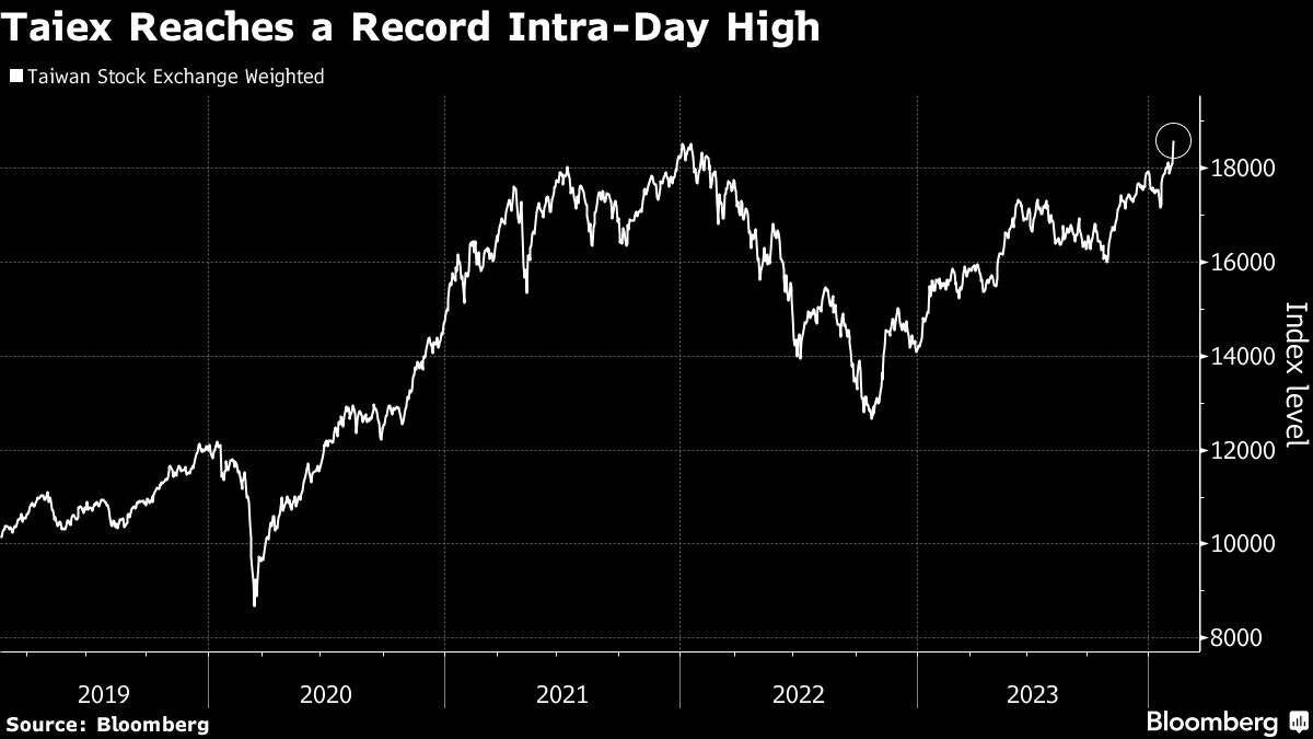 Taiwan's benchmark stock index surged to its highest intraday level on record, as expectations of booming demand for artificial intelligence technology drives investor sentiment.