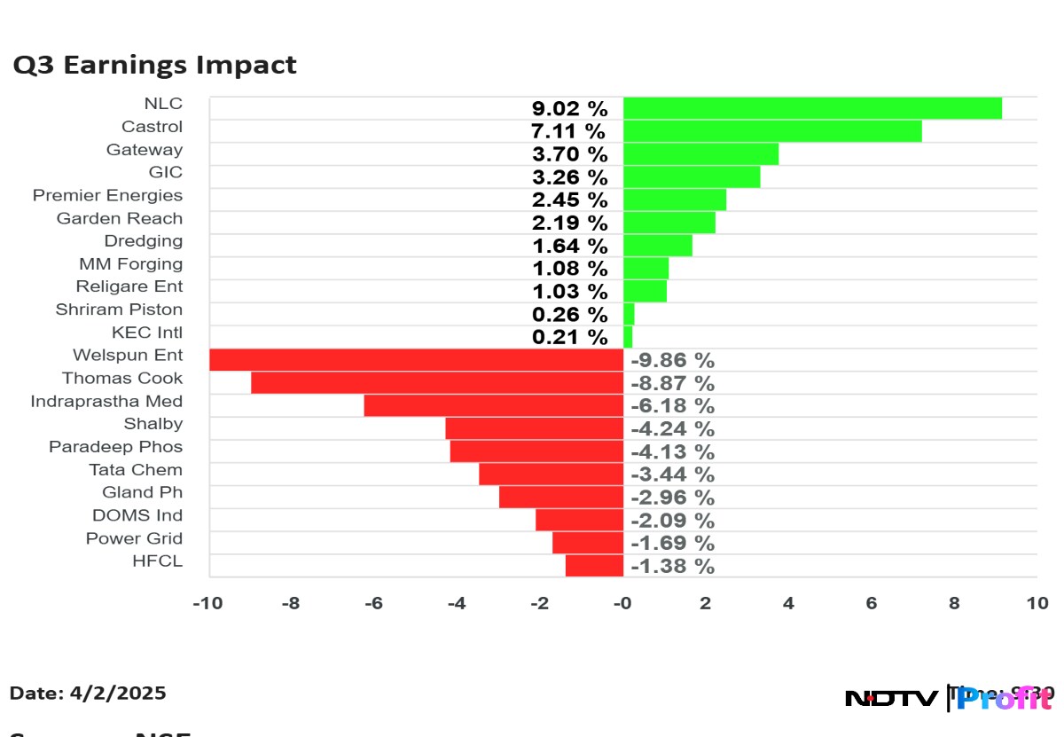 The shares of NLC India Ltd. also rose after it's net profit more than doubled to Rs 668 crore, in comparison to Rs 250 crore reported in the same quarter last year. The shares of Castrol India were also in the positive on Tuesday after its third quarter profit rose 12.2% to Rs 271 crore beating analyst expectations.