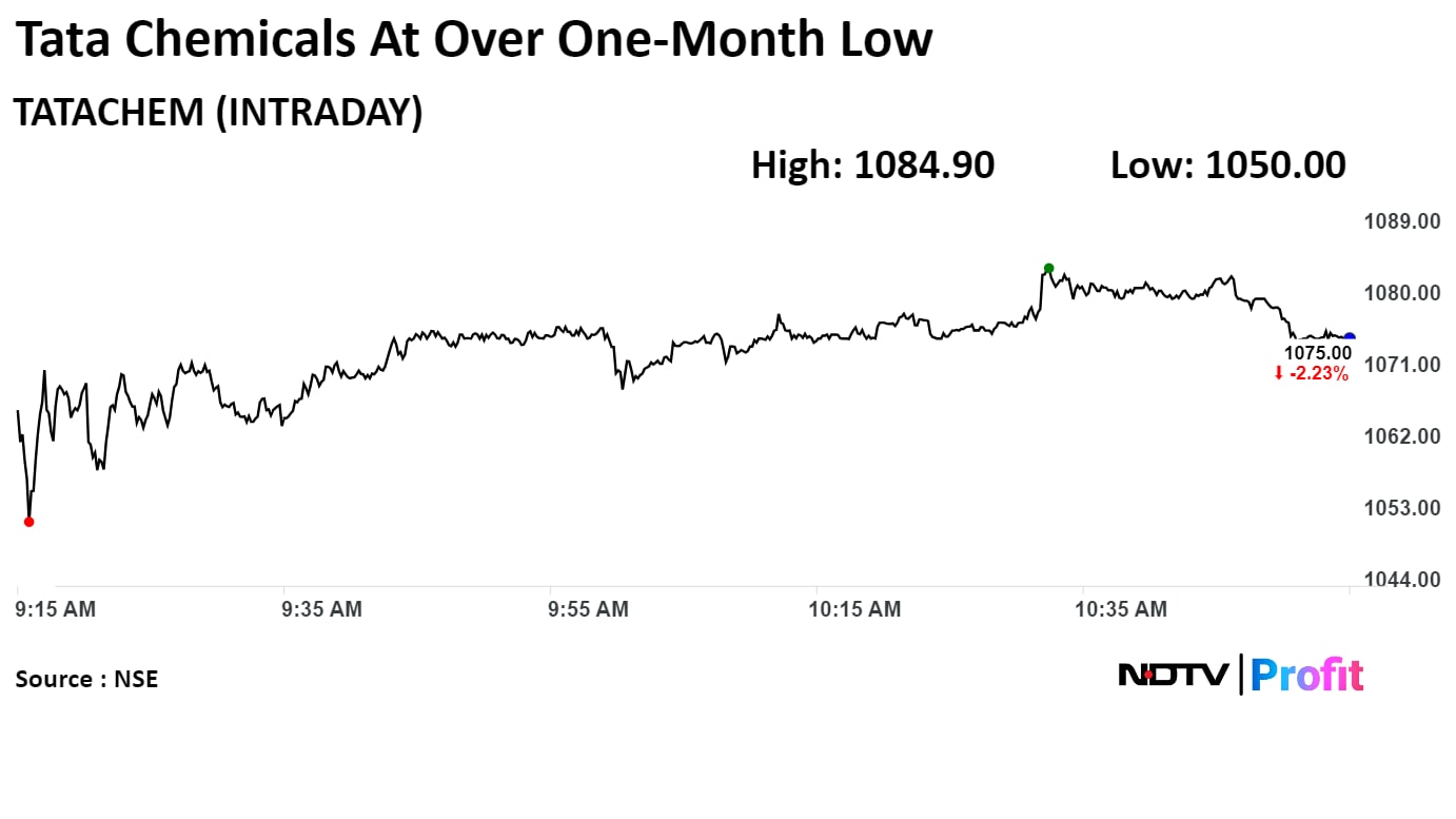 Shares of Tata Chemicals declined 4.50%, the lowest level since March 26, before paring loss to trade 3.05% lower at 10:47 a.m. This compares to a 0.46% advance in the NSE Nifty 50.