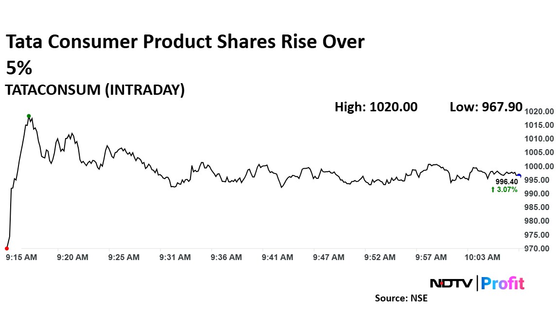 The shares of Tata Consumer rose as much as 5.51% to Rs 1,020 apiece, the highest level since Oct. 31. The stock pared gains to trade 3.20% higher at Rs 997.35 apiece, as of 10:07 a.m. This compares to a 0.45% advance in the NSE Nifty 50 index.