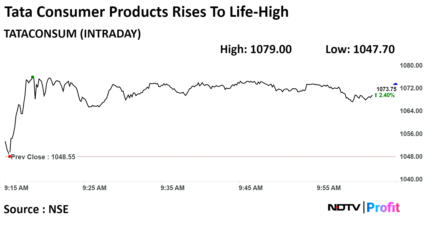 Shares of Tata Consumer Products Ltd. rose as much as 3.65%, highest since its listing on BSE on Aug. 20, 1977, before paring gains to trade 2.97% higher at 10:10 a.m. This compares to a 0.38% decline in the NSE Nifty 50.