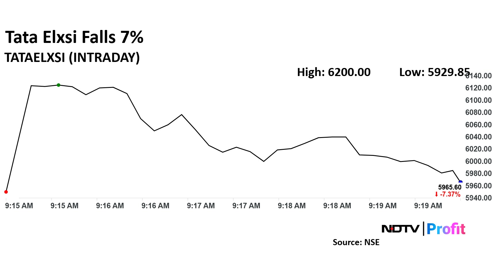 Tata Elxsi fell as much as 7.92% to Rs 5,929.85 apiece, the lowest level since March 29, 2023. It pared losses to trade 7.5% lower at Rs 5,953.5 apiece, as of 9:38 a.m. This compares to a 0.4% decline in the NSE Nifty 50 Index.