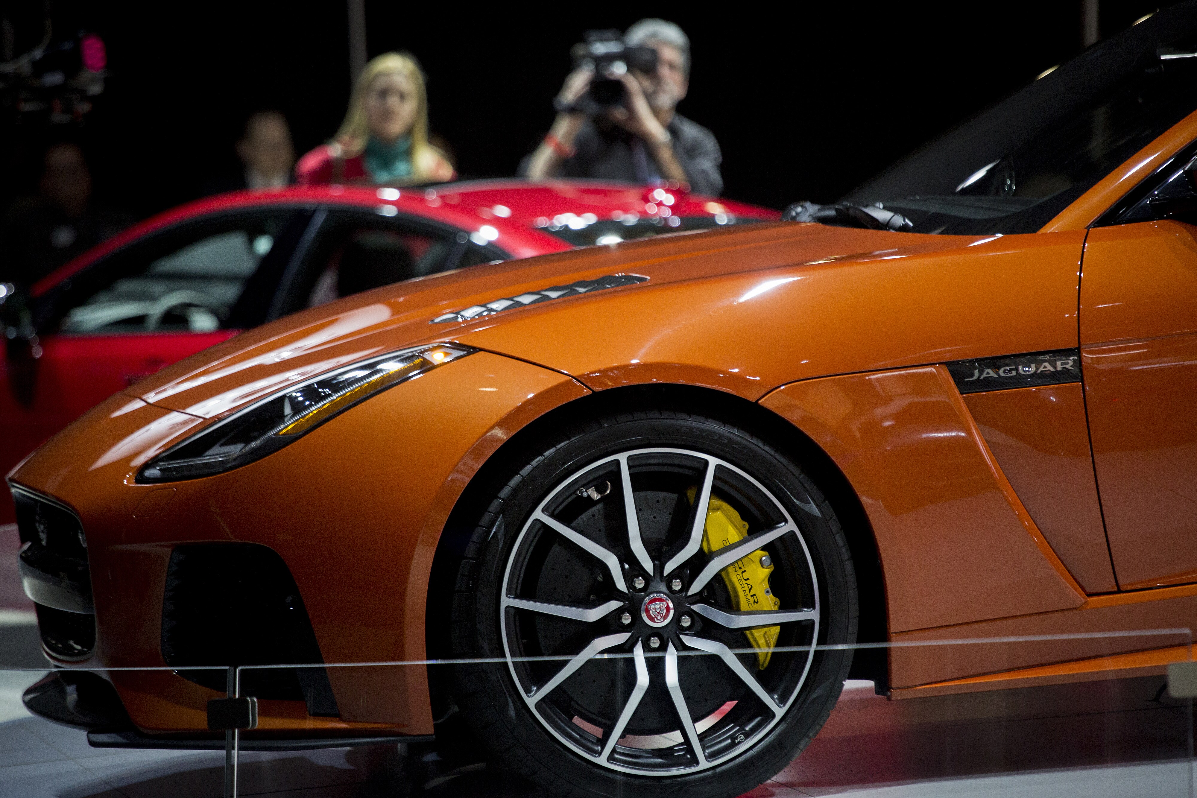 The 2017 Jaguar Land Rover Automotive Plc F-type SVR vehicle is displayed during the 2016 New York International Auto Show in New York. (Photographer: John Taggart/Bloomberg)