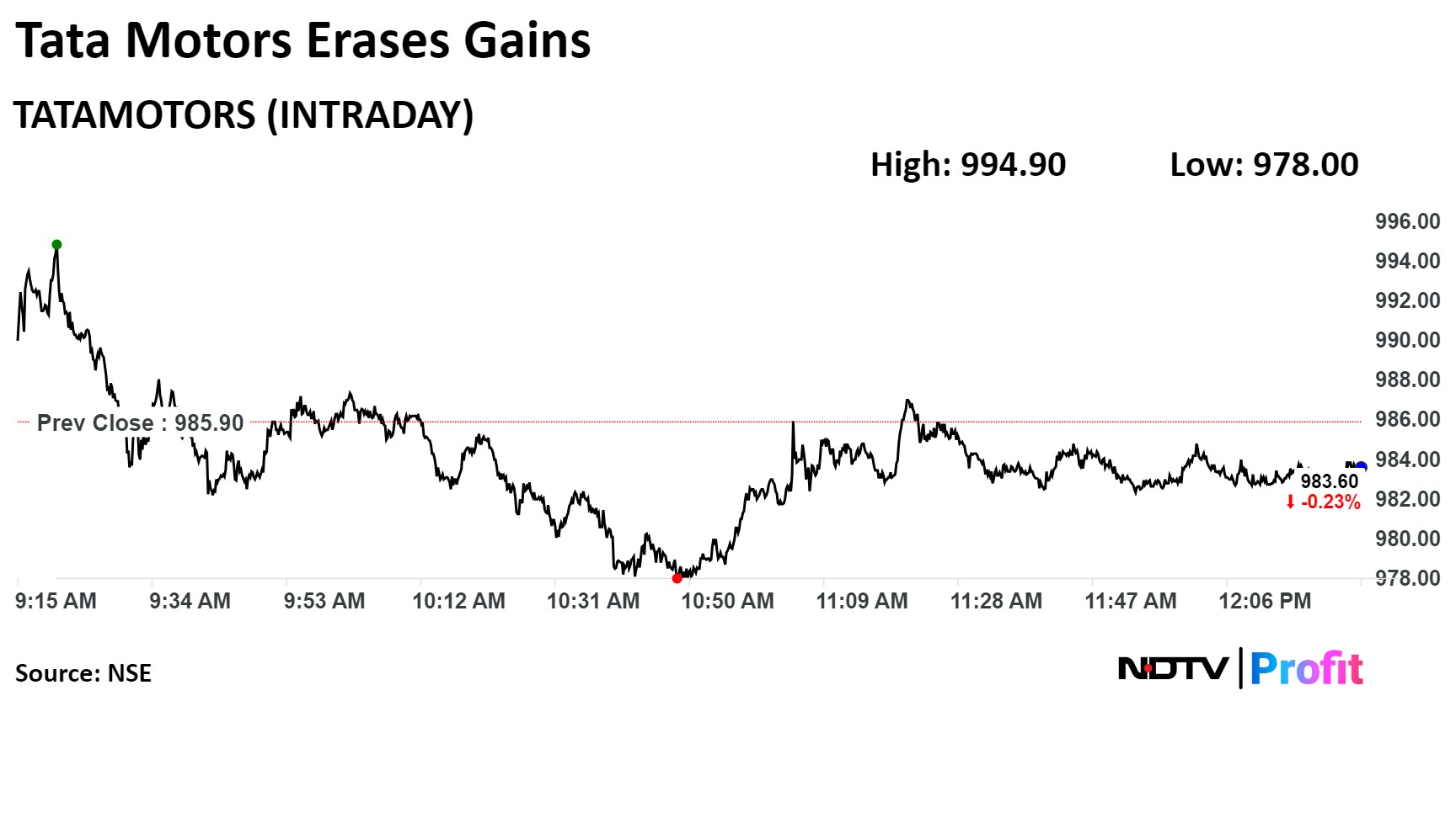 Shares of the company fell as much as 0.91% to Rs 994.90 apiece. It pared losses to trade 0.29% lower at Rs 983.15 apiece as of 12:20 p.m. This compares to a 0.04 decline in the NSE Nifty 50 Index.