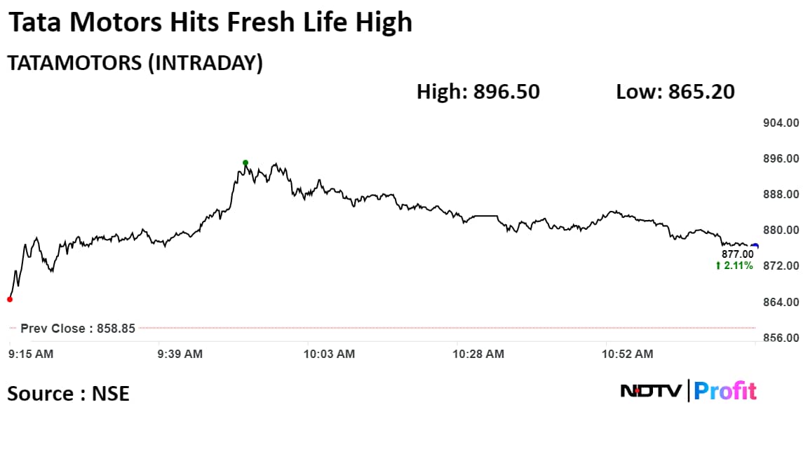 Tata Motors' stock rose as much as 4.38% during the day to Rs 896.50 apiece on the NSE. It was trading 2.38% higher at Rs 879.30 apiece compared to a 0.63% advance in the benchmark Nifty 50 at 11:11 a.m.