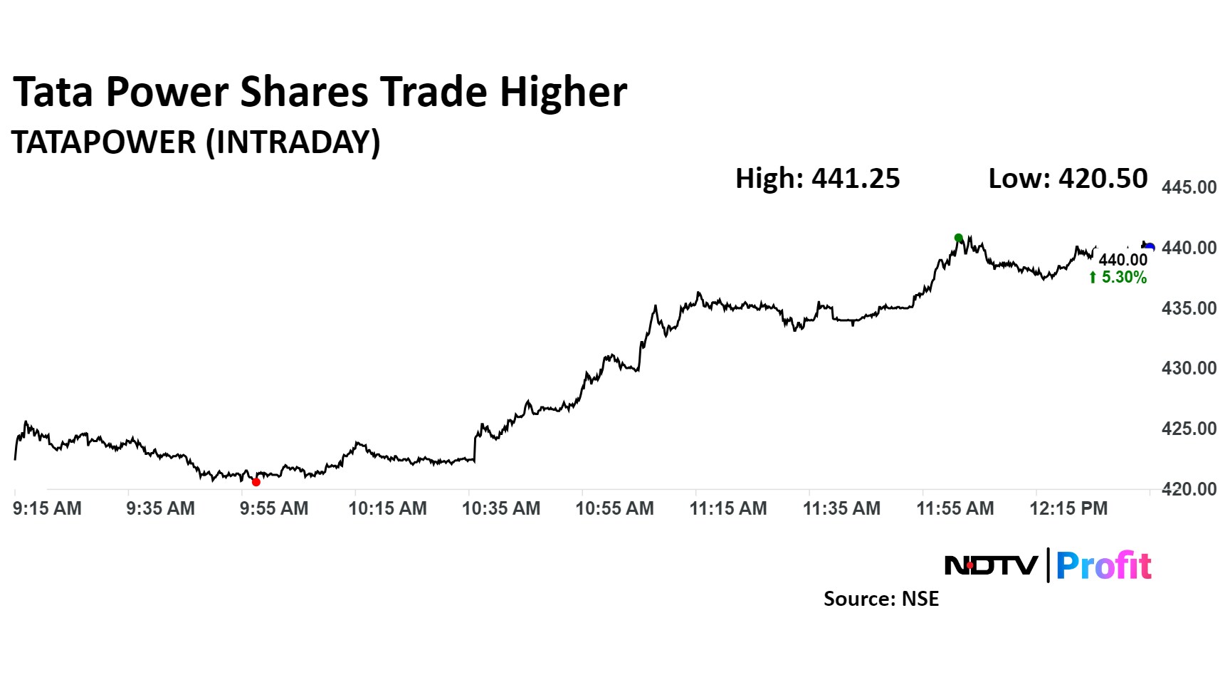 Shares of Tata Power advanced 5.6% to Rs 441.25 apiece. The stock was trading 5.3% higher at Rs 440 apiece by 12:20 p.m. The benchmark NSE Nifty 50 was trading 0.46% higher.