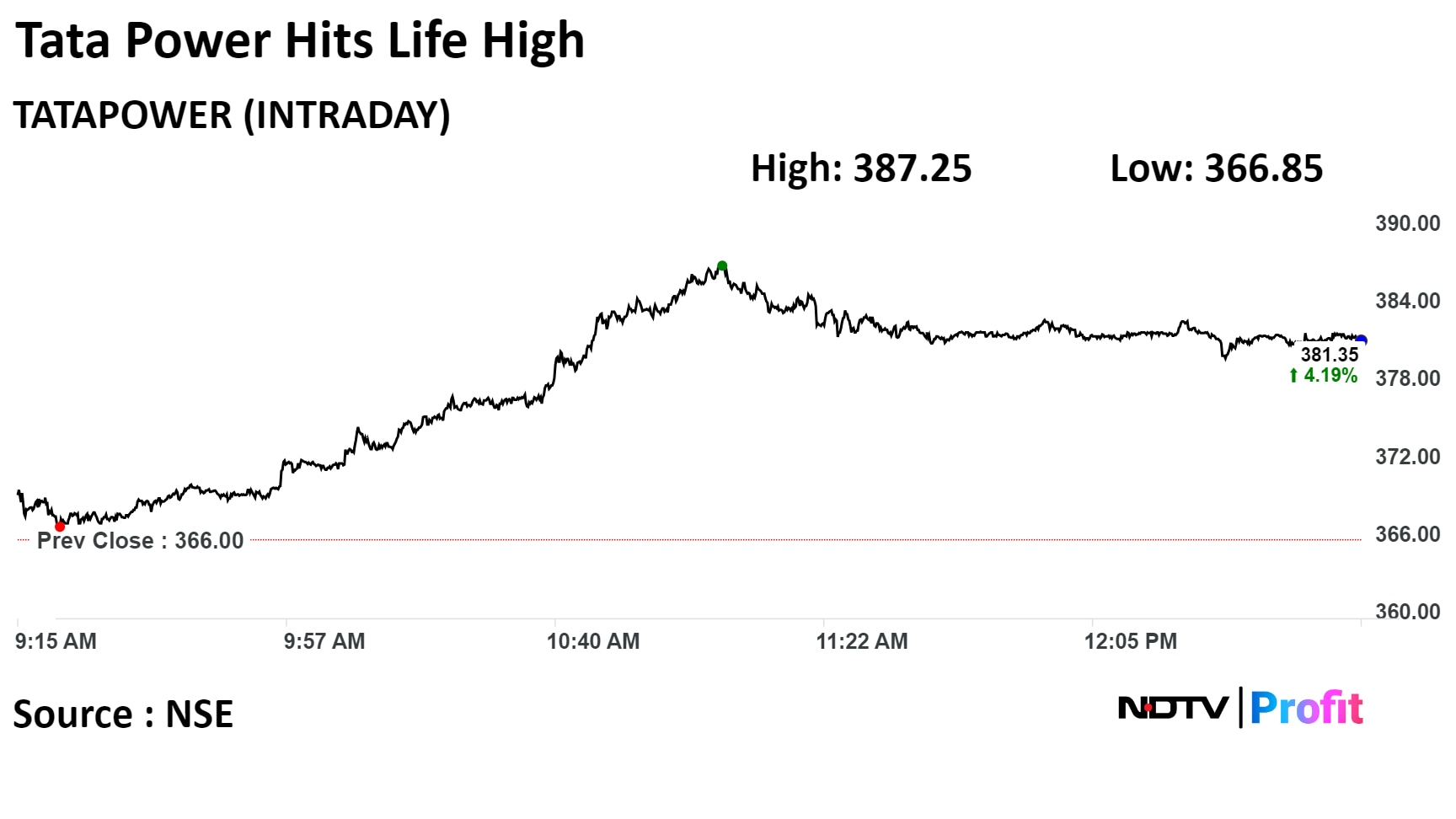 Tata Power's stock rose as much as 6.07% during the day to Rs 387.25 apiece on the NSE. It was trading 4.35% higher at Rs 381.65 per share compared to a 1.14% advance in the benchmark Nifty 50 at 12:57 p.m.