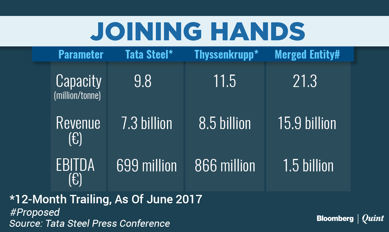 About €2.5 billion of Tata Steel Europe's senior debt will go to the joint venture, said Koushik Chatterjee, group executive director at the Indian steelmaker. Debt of Tata Steel Europe will not be consolidated with Tata Steel, Chatterjee said. The company has nearly $8 billion debt, of which $3.2 billion was term loans and the remaining working capital financing, he said. Thyssenkrupp will transfer around €3.6-4 billion of debt, which is mainly steel-related pension liabilities and some legacy business liabilities, Chatterjee told BloombergQuint in an interview.