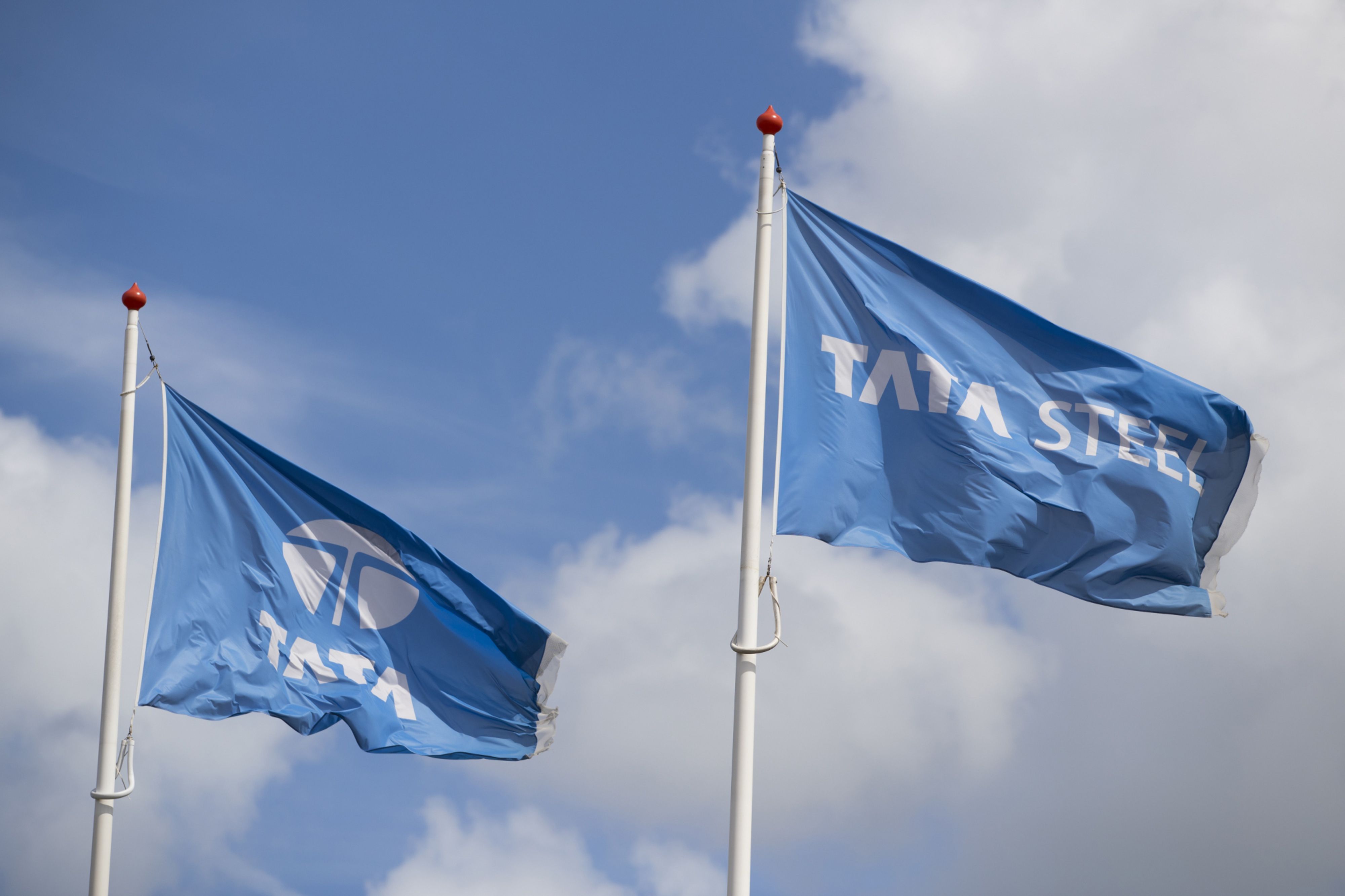The Tata Steel Ltd. logo sits on a flags flying outside a Tata Steel plant. (Photographer: Jasper Juinen/Bloomberg)