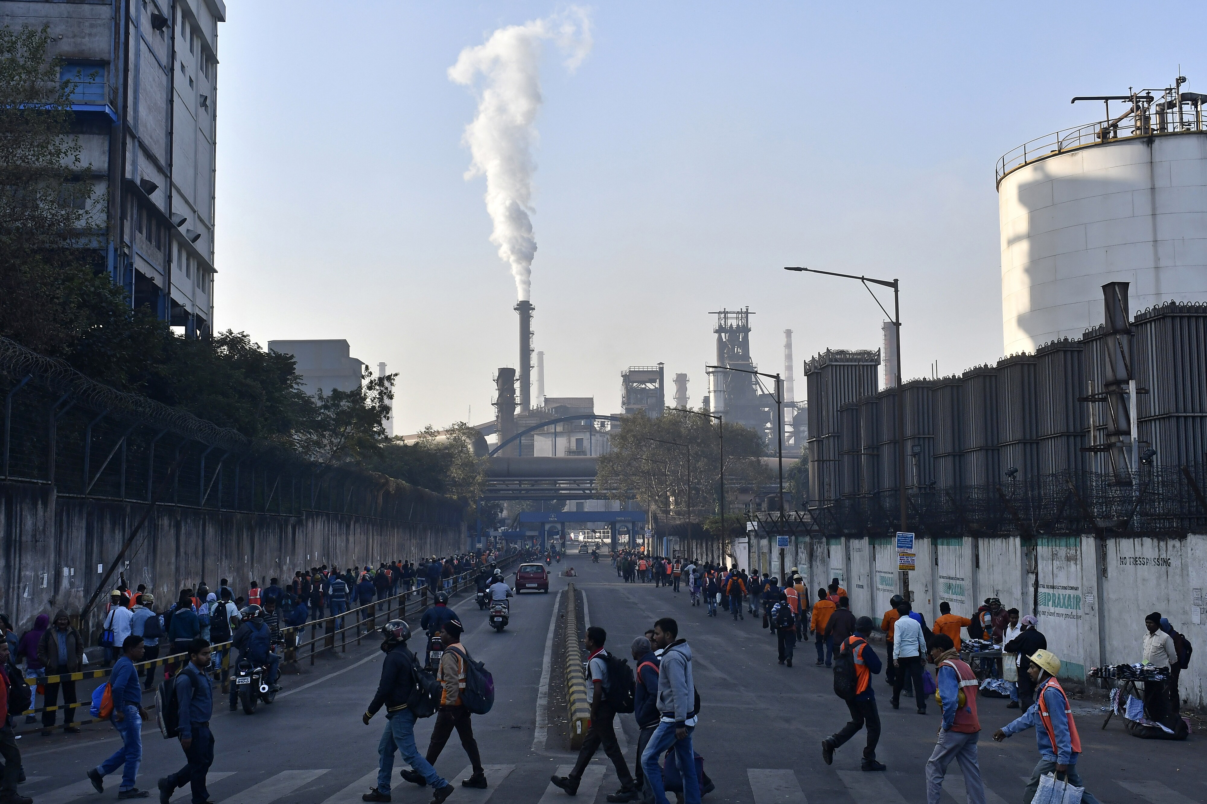 Workers walk towards a Tata Steel Ltd. plant in Jamshedpur, Jharkhand, India. (Photographer: Anindito Mukherjee/Bloomberg)
