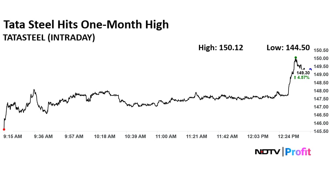 The shares of Tata Steel rose as much as 5.14% to Rs 150.12 apiece, the highest level since April 3. The stock pared gains to trade 4.62% higher at Rs 149.36 apiece, as of 12:41 p.m. This compares to a 3:25% advance in the NSE Nifty 50 Index.