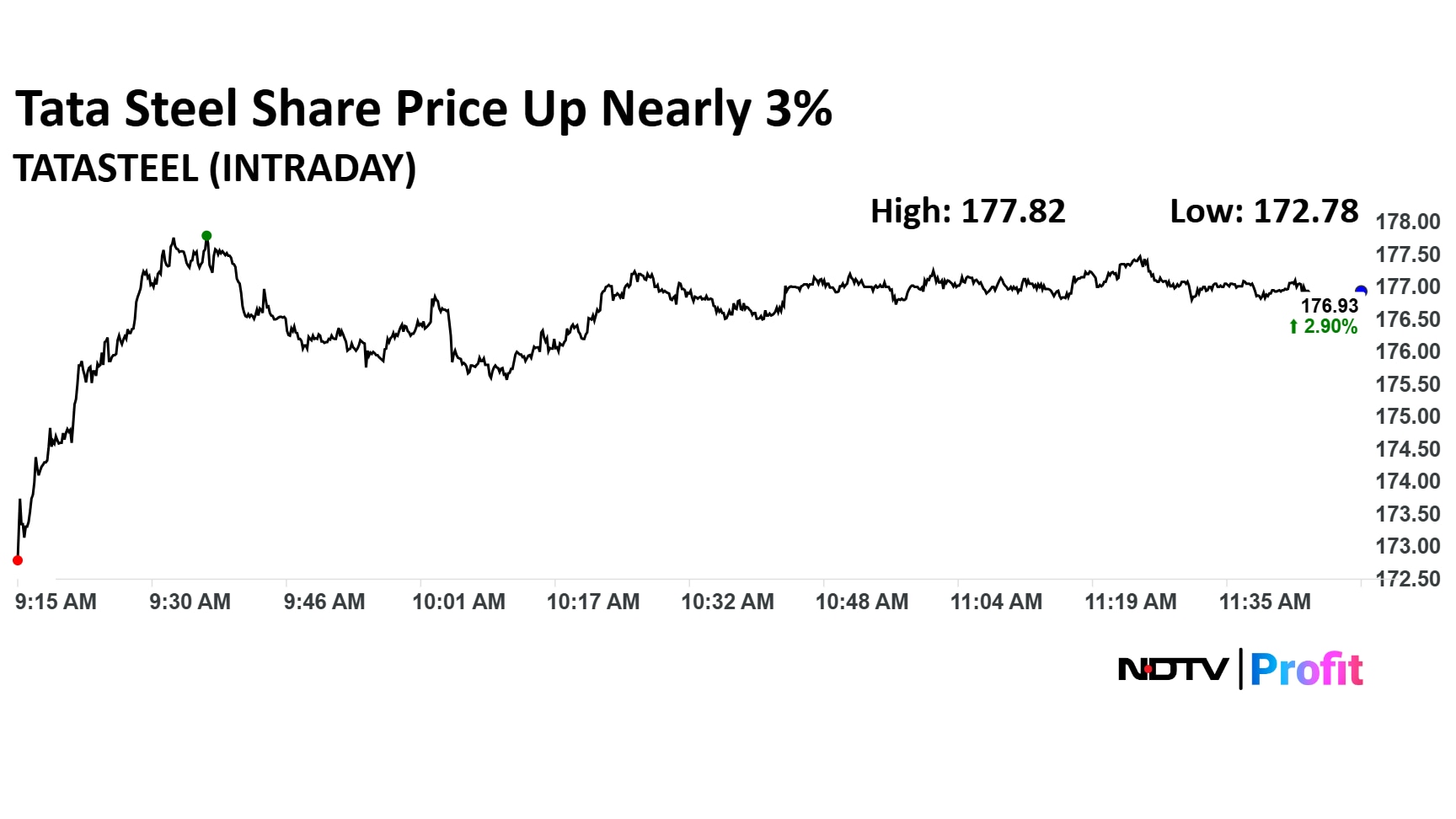 Tata Steel stock rose as much as 3.42% during the day to Rs 177.8 apiece on the NSE. It was trading 2.89% higher at Rs 176.9 apiece, compared to an 0.38% advance in the benchmark Nifty 50 as of 12:12 p.m.