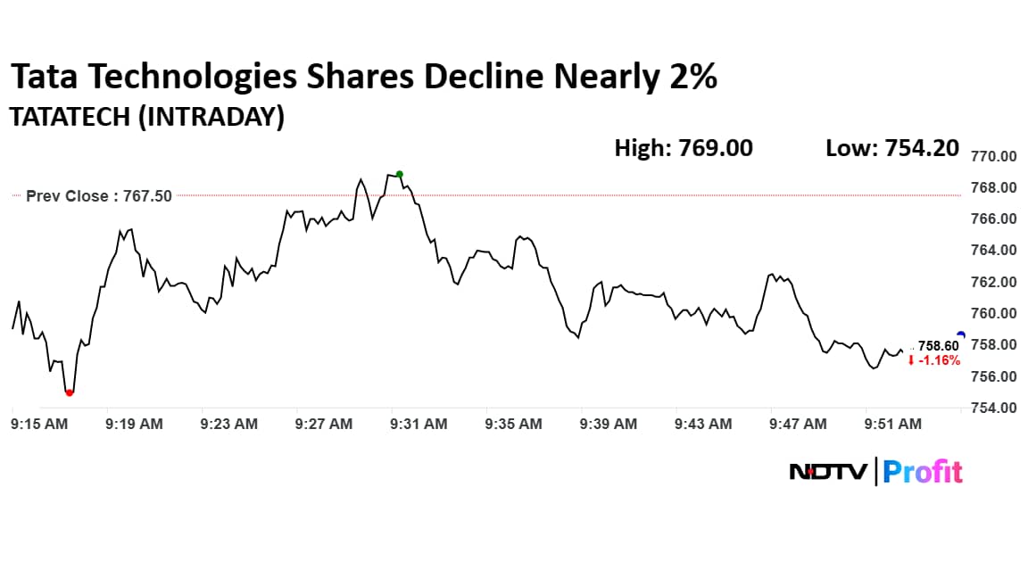 Shares of Tata Technologies fell as much as 1.73% to Rs 754.20 apiece, the lowest level since May 28. They pared losses to trade 1.26% lower at Rs 756.95 apiece, as of 9:16 a.m. This compares to a 0.23% advance in the NSE Nifty 50.