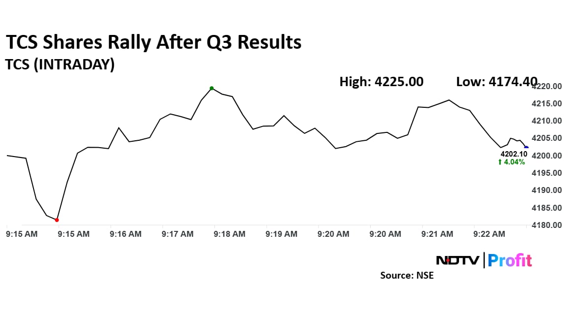 TCS's stock rose as much as 4.6% during the day to Rs 4,225 apiece on the NSE. It was trading 4.1% higher at Rs 4,206 apiece, compared to a 0.19% advance in the benchmark Nifty 50 as of 09:18 a.m.
