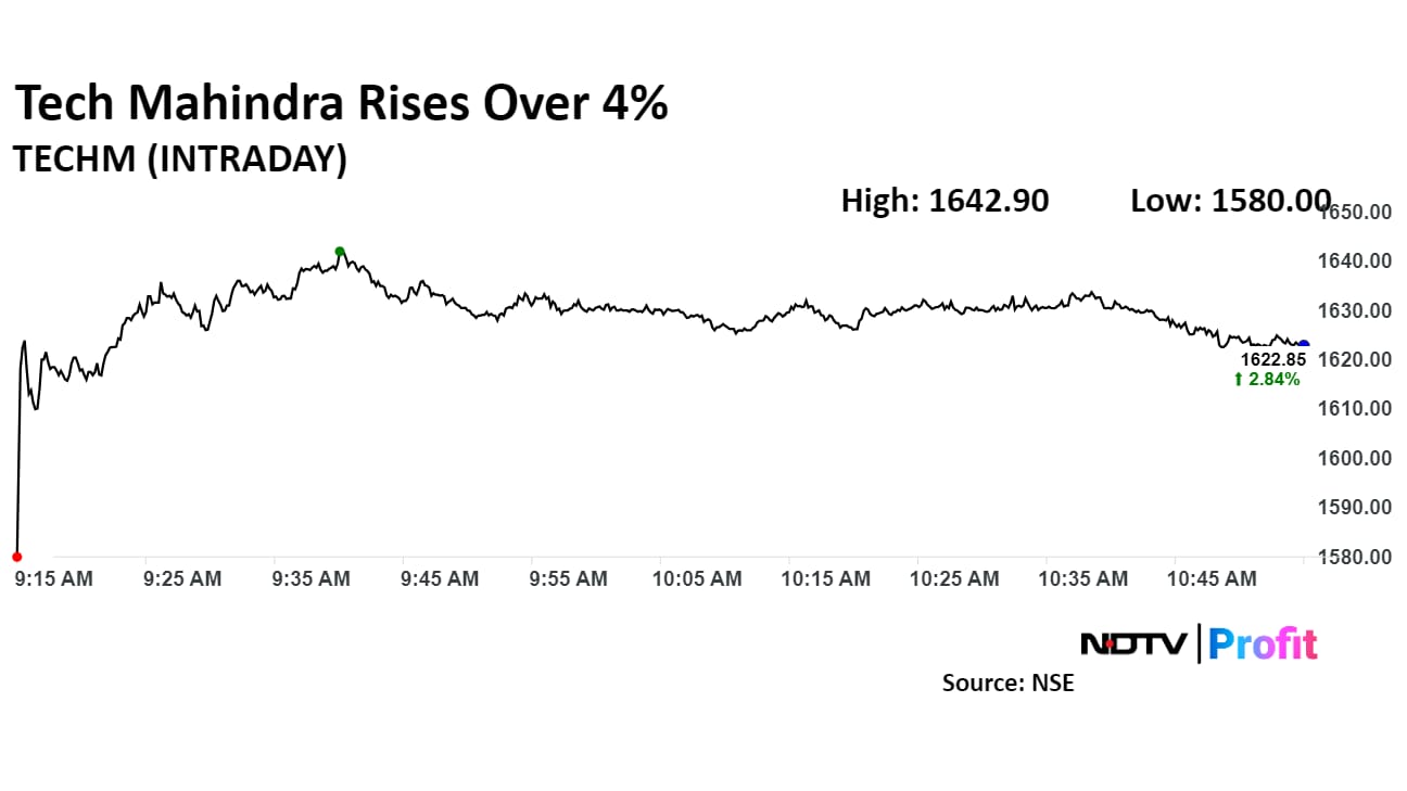 Tech Mahindra Ltd. shares rose as much as 4.17%, the highest level since Sept. 27. They pared gains to trade 2.85% higher at Rs 1,622.20 apiece as of 10:55 a.m., compared to a 0.22% decline in the NSE Nifty 50.