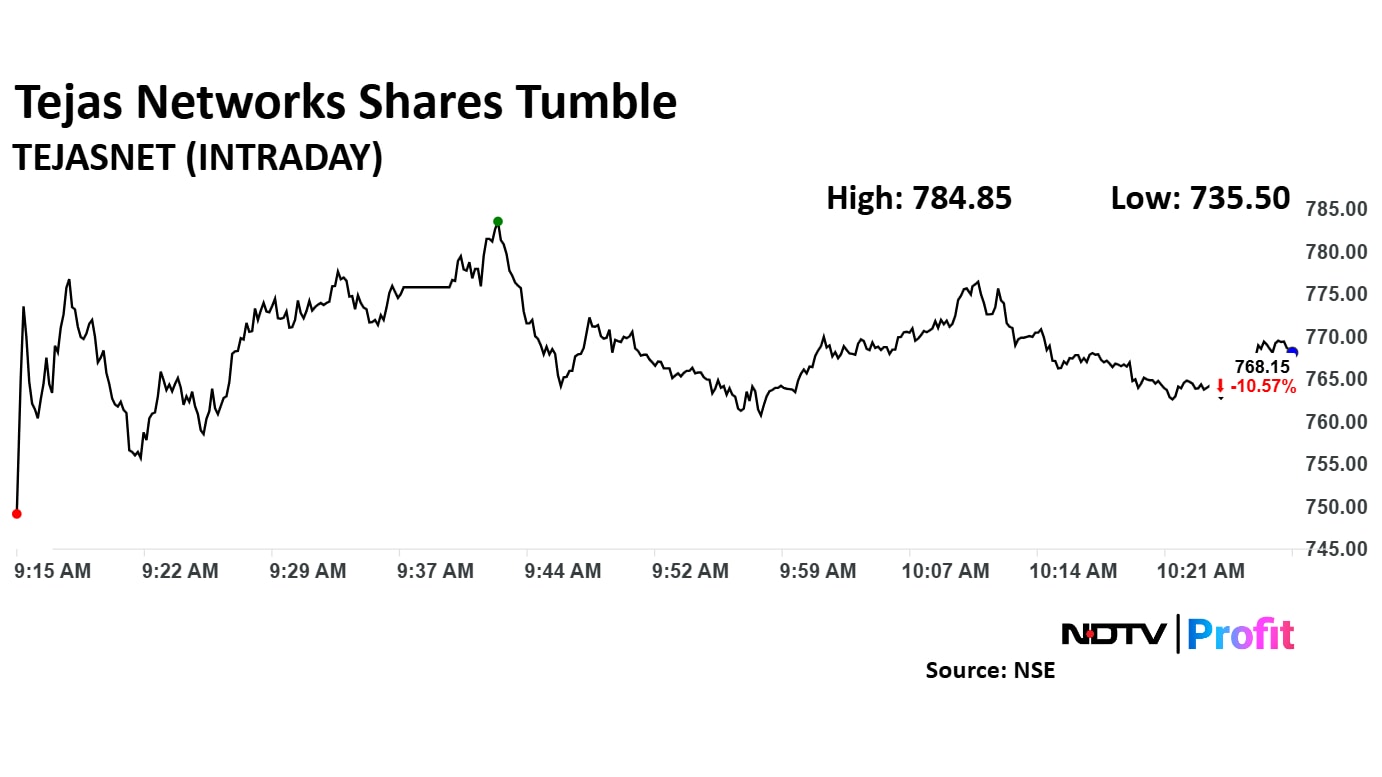Share price of Tejas Networks Ltd. fell over 14% in trade on Monday after the company swung to loss in the quarter ended March 31, 2025.