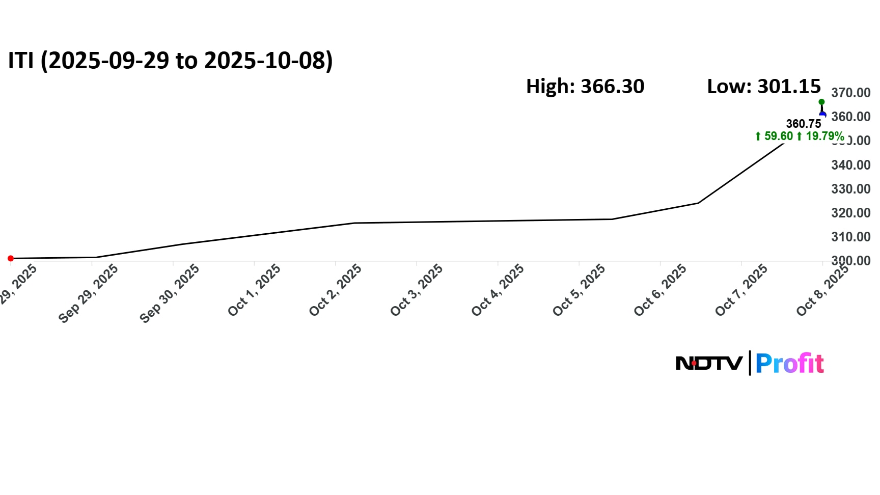 ITI share price advanced 12.6% intraday to Rs 365 apiece on Wednesday, compared to a flat Nifty 50. The total traded volume so far in the day stood at 21 times its 30-day average with a turnover of Rs 847 crore on the NSE. The relative strength index was at 76, indicating the stock is overbought.