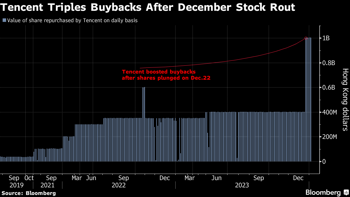China's most valuable company sharply accelerated its pace of purchases as the shock announcement triggered a 12% plunge on Dec. 22. Tencent has since ramped up its pace of daily purchases to about HK$1 billion, compared with an average of HK$375 million a day last year prior to the sweeping restrictions.
