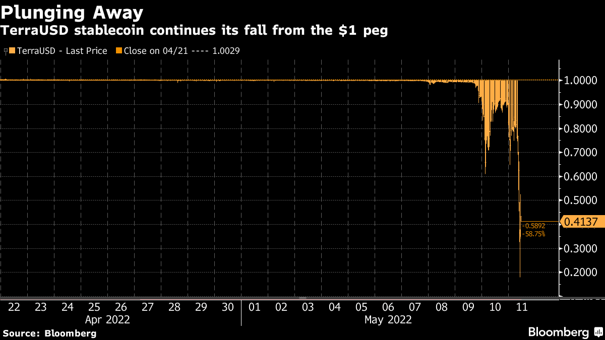 The token fell further from its intended 1-to-1 peg to the US dollar to trade at around 50 cents at 10 a.m. in London, wiping out billions of dollars of value, data compiled by Bloomberg show. Luna, a coin that's part of the peg mechanism for TerraUSD, tumbled 83% over the past 24 hours, according to CoinMarketCap.
