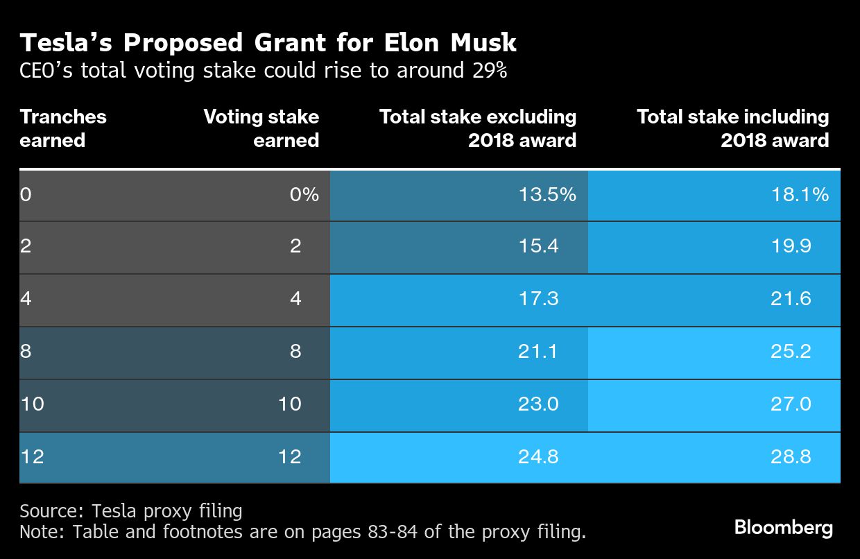 The additional shares Musk could receive would push his stake in the electric-vehicle maker to at least 25%, according to the terms detailed in Tesla's proxy filing Friday. Musk has publicly stated he wants a stake of that size.