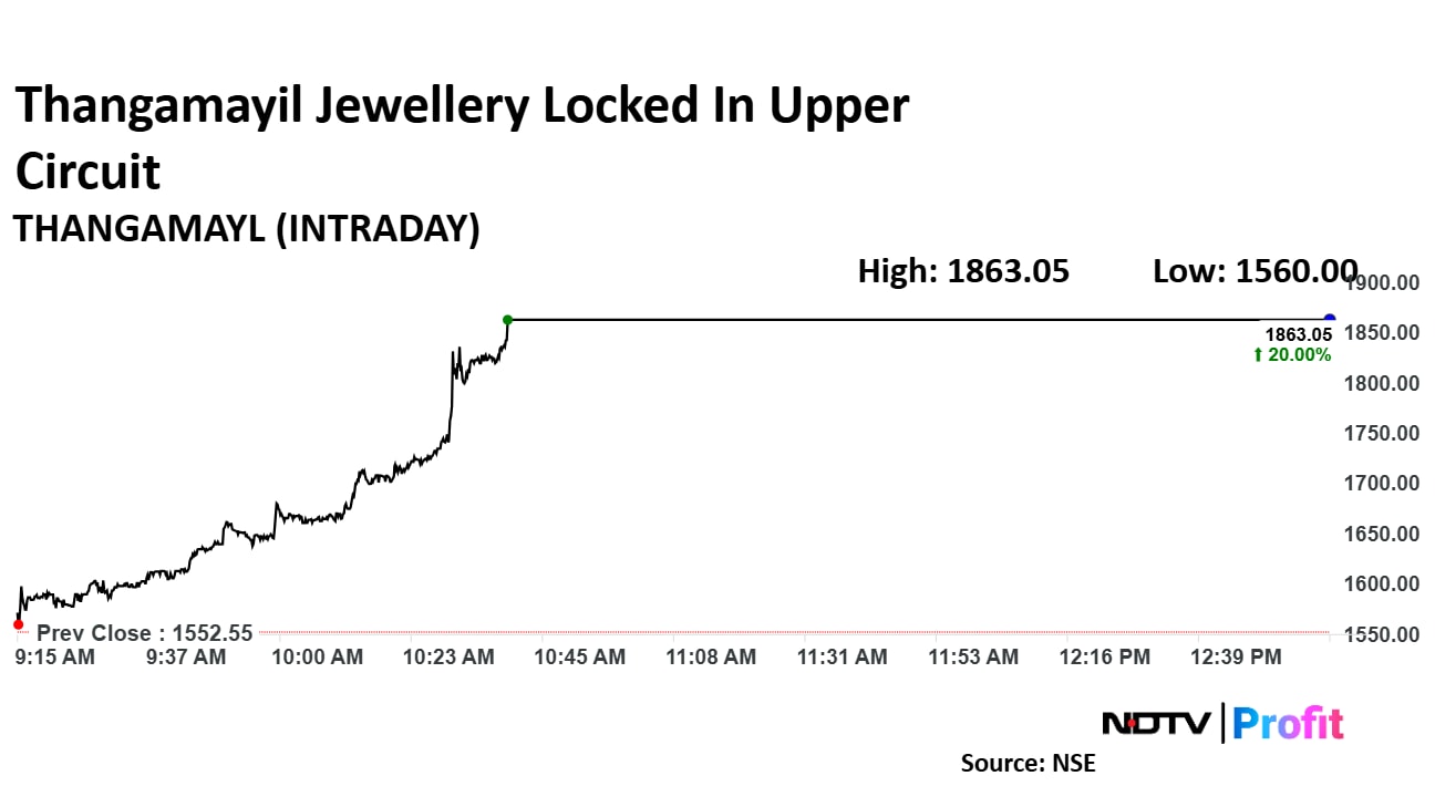 Thangamayil Jewellery share price rose 20% to Rs 1,863.05 apiece, the highest level since Feb 10. The scrip snapped a seven-day losing streak on Tuesday. It remained locked in the upper circuit as of 12:59 p.m., as compared to 0.09% advance in the NSE Nifty 50 index.