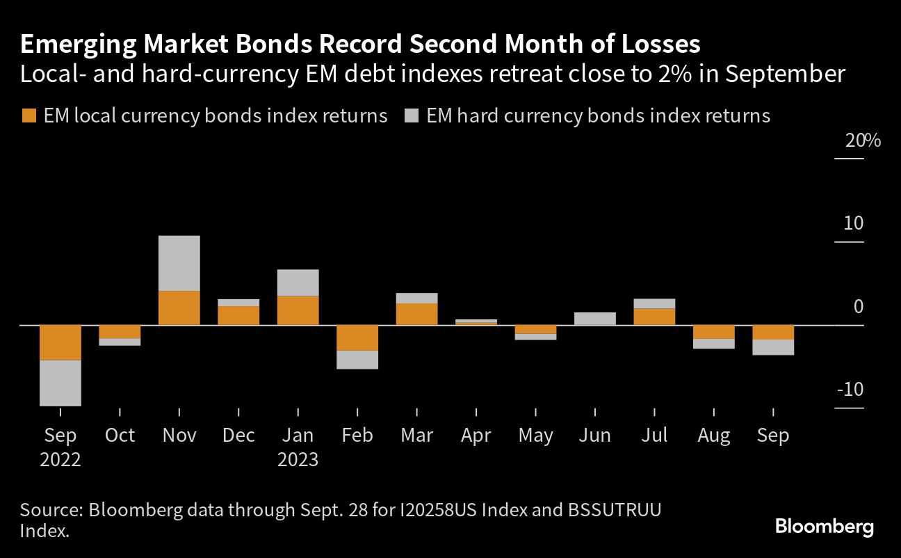 A stronger dollar and surging US yields, combined with China's economic woes, brought it all to a head. Emerging-market stocks just posted their worst quarter in a year, wiping out the majority of 2023's gains. Currencies aren't far behind.