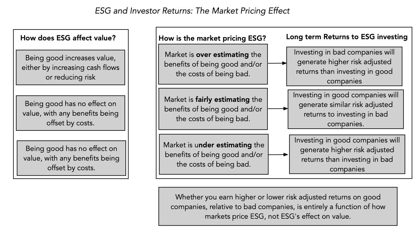 If the argument that ESG translates into higher value is weak, the argument that incorporating ESG into your investing is going to increase your returns fails a very simple investment test. For any variable, no matter how intuitive and obvious its connection to value might be, to generate "excess" returns, you have to consider whether it has been priced in already. That is why investing in a well-managed company or one that has high growth does not translate into excess returns, if the market already is pricing in the management and growth. Applying this principle to ESG investing, the question of whether ESG-based investing pays off or not depends on not only whether you think ESG increases or decreases firm value, but also on whether the market has already priced in the impact.