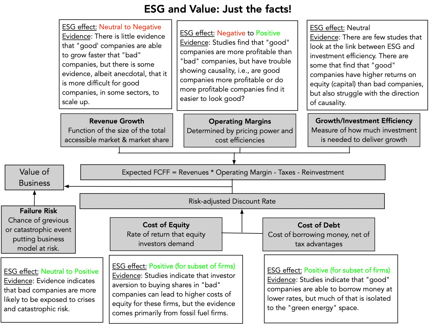 If the ESG sales pitch to companies, which is that if you are a ‘good' company, you will be worth more, is right, why do we need ESG? In fact, Milton Friedman, the bête noire of ESG advocates, would stand vindicated, and companies would do good, because it made them more profitable and valuable, and not because of lectures about morality and goodness. This may be cynical, on my part, but the very fact that ESG advocates keep insisting that being ‘good' increases value must be because they are themselves unsure why or whether this is true. The framework for tracing out the effect of ESG on value is a simple one, since ESG, if it affects value, has to affect one of four variables: revenue growth (by increasing or decreasing growth), operating profit margins, reinvestment efficiency (the payoff to investing in new capacity) or risk (through the cost of funding/capital and failure risk). In last year's post, I noted that the empirical evidence that ESG has a positive payoff is weak, at best, and inconclusive, for the most part: