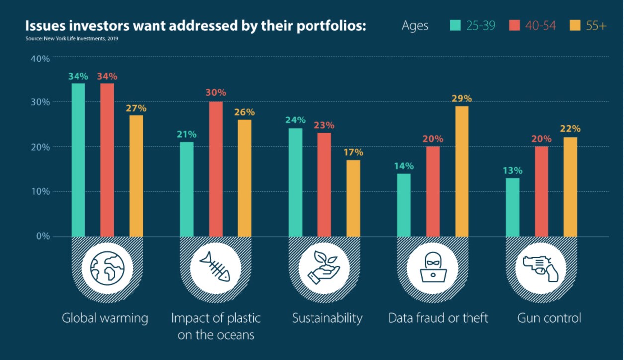 To illustrate how investors can differ on core values, consider the chart below, where investors were asked to assess which issues should rank highest, when considering corporate goodness: